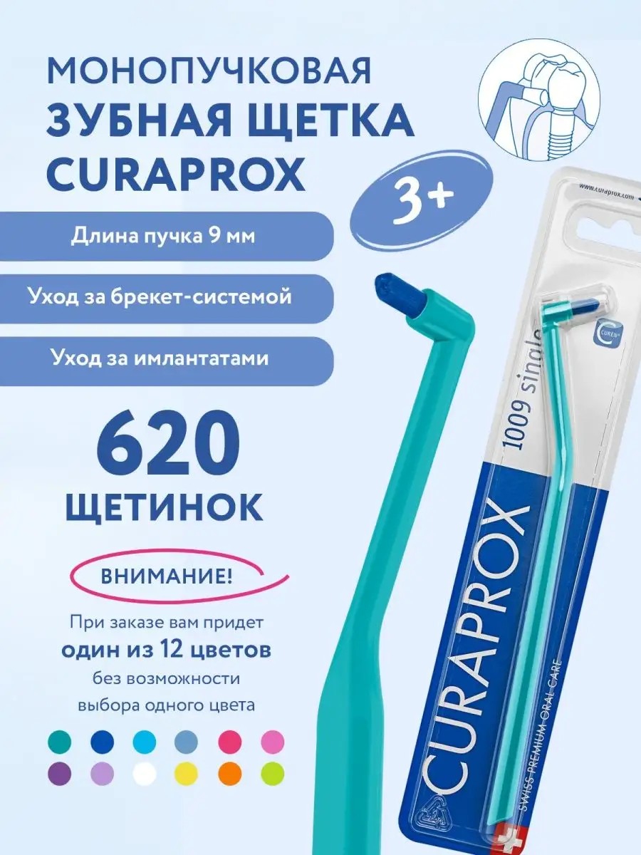 It's not possible to choose the color of the Curaprox bristles and handle; the full range of available colors is shown in the second photo. The Swiss-made CURAPROX CS 1009 single-tuft toothbrush with a tuft length of 9 mm is an indispensable accessory for high-quality oral hygiene with braces, implants, and crowns. This single-tuft toothbrush provides thorough care of the gum area. Its small, rounded head reaches the most difficult-to-reach areas of the mouth. It effectively cleans interdental spaces, gum margins, and fissures on chewing teeth. It is especially suitable for people undergoing or completing braces treatment and in the retention period, as well as for clients with bridges, crowns, and implants, as well as for those with sensitive gums. Patented CUREN bristles create an exceptionally dense and effective cleaning surface. CUREN bristles are denser than nylon, absorb less moisture, and retain 60% more of their cleaning properties. They gently clean the enamel surface, more thoroughly breaking down and removing plaque, especially in the gingival sulcus. The small, compact, slightly angled toothbrush head ensures the brush is positioned correctly in the gingival area. The lightweight polypropylene handle helps brush at the correct angle. The brush contains 620 perfectly rounded bristles measuring 9 mm in length. The Curaprox toothbrush is ideal for effective tooth cleaning and the prevention of cavities, gum disease, and other oral health issues. There are no contraindications for using this brush, and the single-tufted device is recommended for everyone. The brush is used as an additional hygiene tool for more thorough cleaning and plaque removal. It is easy to use, and its compact size makes it easy to take on a trip, to work, or on the go. A single-tuft toothbrush won't replace a traditional toothbrush. It should be used in conjunction with standard hygiene products.