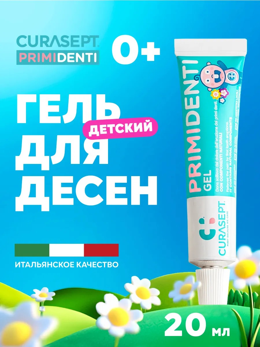 Обезболивающий и антисептический детский гель для десен CURASEPT PRIMIDENTI "Первые Зубы" при прорезывании зубов для детей от 0 до 3-х лет создан на основе натуральных компонентов. Без сахара, спирта и местных анестетиков. Применяется при симптомах прорезывания зубов: отечность или покраснение десен, а также гиперсаливация (обильное слюноотделение).