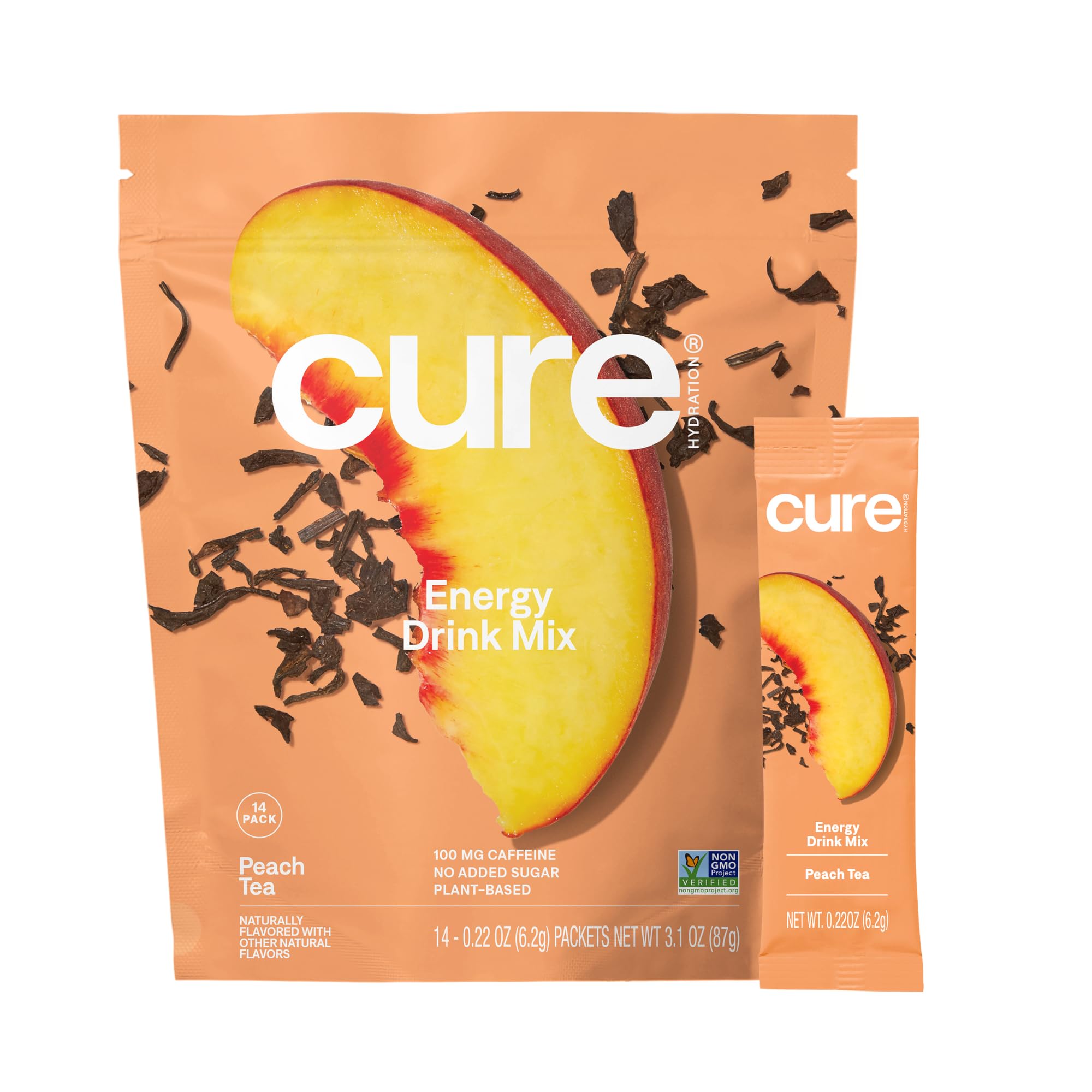 Cure Hydration Performance | Plant-Based Electrolyte Energy Drink Mix | No Added Sugar | Dehydration Relief Powder | 100mg of Caffeine | Non-GMO | Vegan | Pouch of 14 Packets - Peach