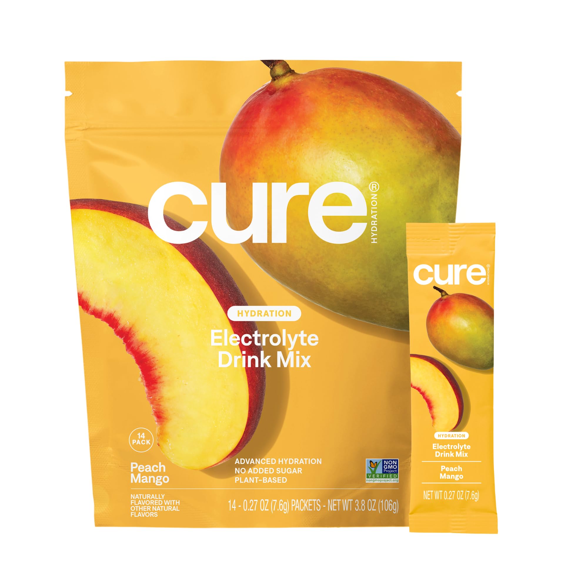 Cure Hydration | Plant-Based Electrolyte Drink Mix | No Added Sugar | FSA-HSA | Dehydration Relief Powder Made with Coconut Water | Non-GMO | Vegan | Pouch of 14 Packets - Peach Mango