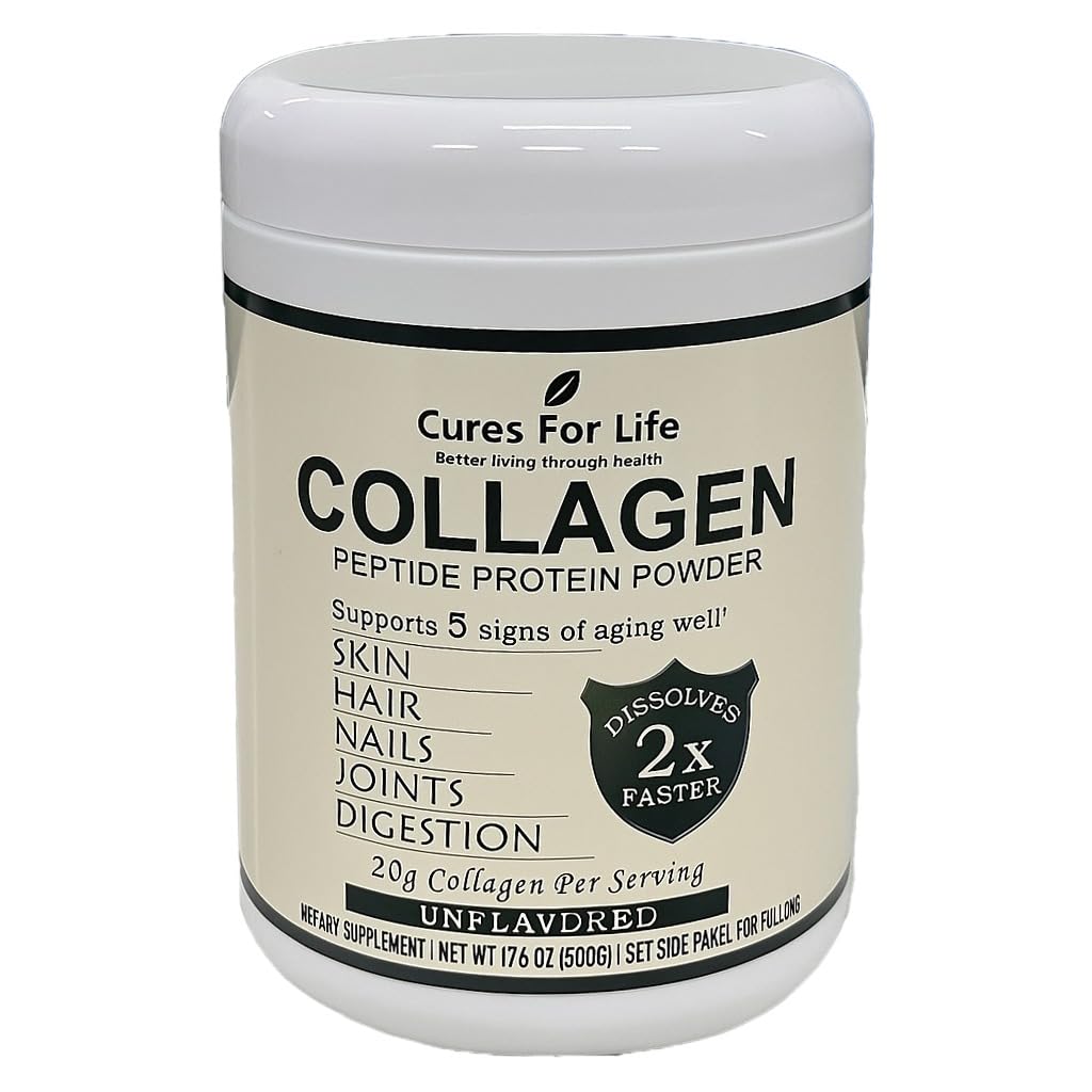 Cures For Life Collagen Peptides Powder is a premium, unflavored supplement crafted for whole-body wellness. Made from hydrolyzed bovine collagen, it dissolves easily in hot or cold liquids, offering a smooth, tasteless boost to your coffee, smoothie, or water. Sourced from pasture-raised, grass-fed cows, it's rich in Type I III collagen—supporting youthful skin, strong hair and nails, joint flexibility, and healthy digestion. Non-GMO, Keto-friendly, and Kosher-certified, this 500g tub offers a clean, effective supplement for your daily routine.