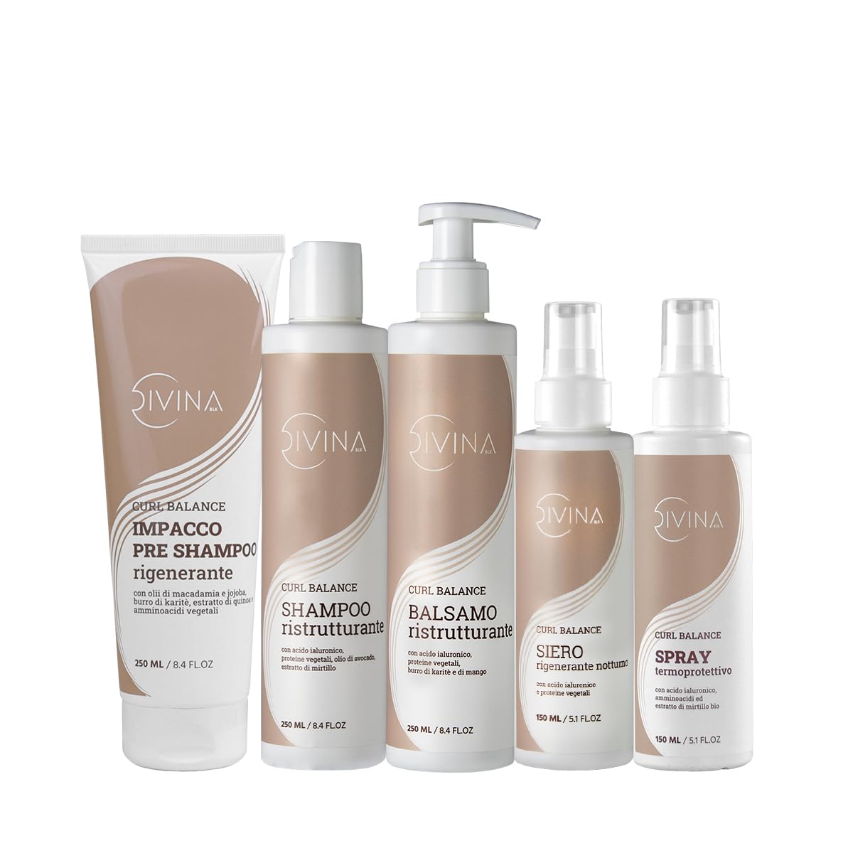 DIRECTIONS: Apply the Regenerating Night Serum in the evening and leave it on overnight. When washing your hair, apply the Restructuring Shampoo to your scalp, massaging it in rinse and apply the Restructuring Conditioner, leave it on for 5 minutes, and rinse again. Apply the Heat Protectant Spray after styling products, then proceed with drying. Composition: Regenerating Night Serum Restructuring Shampoo Restructuring Conditioner Heat Protectant Spray. These four restructuring products work to restore strength and vitality to damaged curls by repairing the hair fiber, protecting them from heat damage, and restoring their natural health.MODE D'EMPLOI: Appliquer le Sérum de Nuit Régénérant le soir et laisser agir toute la nuit. Lorsque vous vous lavez les cheveux, appliquez le Shampooing Restructurant sur le cuir chevelu, en massant le cuir chevelu rincé et étalez le Baume Restructurant, laissez agir 5 minutes et rincez. Appliquer le Spray Thermoprotecteur après les produits coiffants, puis procéder au séchage. Composition: Sérum de Nuit Régénérant Shampooing Restructurant Baume Restructurant Spray Thermoprotecteur. Les quatre produits Restructurants agissent pour redonner force et vitalité aux boucles abîmées, en réparant la fibre capillaire, en les protégeant des dommages causés par la chaleur et en leur redonnant leur santé naturelle.Curl Balance traitement complet restructurant et protecteur pour cheveux ondulés, bouclés, super-bouclés, afro de Divina BLK