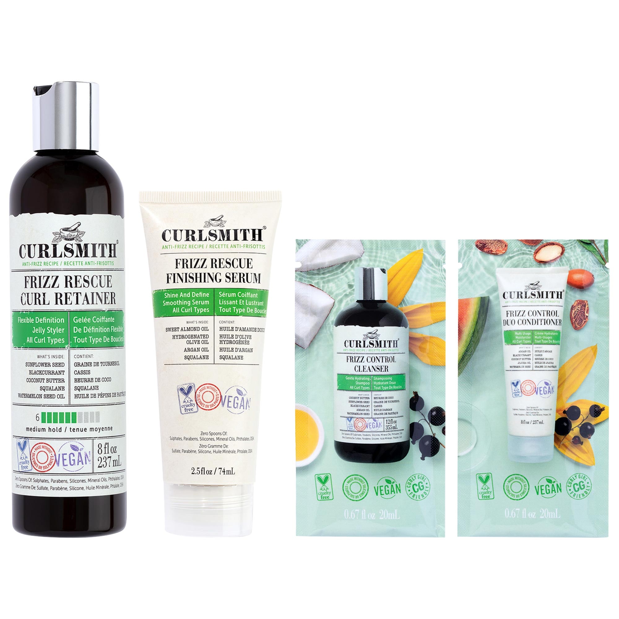 Frizz Rescue Curl Retainer:Water (Aqua/Eau), Propanediol, Helianthus Annuus (Sunflower) Seed Extract, Hydrolyzed Corn Starch, Dehydroxanthan Gum, Citrullus Lanatus (Watermelon) Seed Oil, Cocos Nucifera (Coconut) Seed Butter, Squalane, Argania Spinosa (Argan) Kernel Oil, Coco-Caprylate/Caprate, Ribes Nigrum (Black Currant) Seed Oil, Helianthus Annuus (Sunflower) Seed Oil, C9-12 Alkane, Glycerin, Behentrimonium Chloride, Pentylene Glycol, Panthenol, Niacinamide, Tocopherol, Laureth-2, Thylhexylglycerin, Fragrance (Parfum), Citric Acid, Sodium Gluconate, Phenoxyethanol, Sodium Benzoate, Potassium Sorbate, Limonene, Linalool, Citronellol.