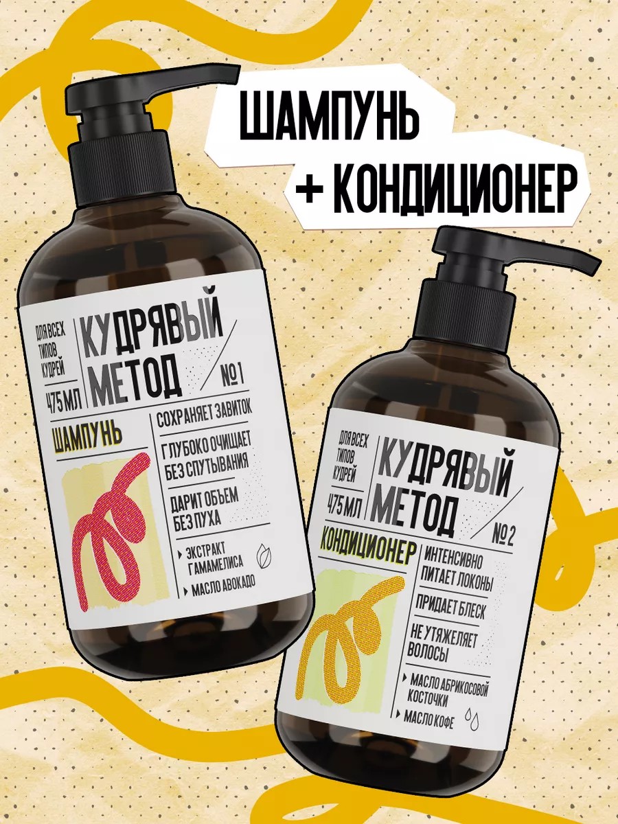 Профессиональный уход для кудрявых и вьющихся волос «Кудрявый Метод». Набор включает в себя шампунь и кондиционер. Вместе средства глубоко очищают кожу головы, обеспечивают увлажнение и восстановление, а также облегчают расчесывание кудрей.