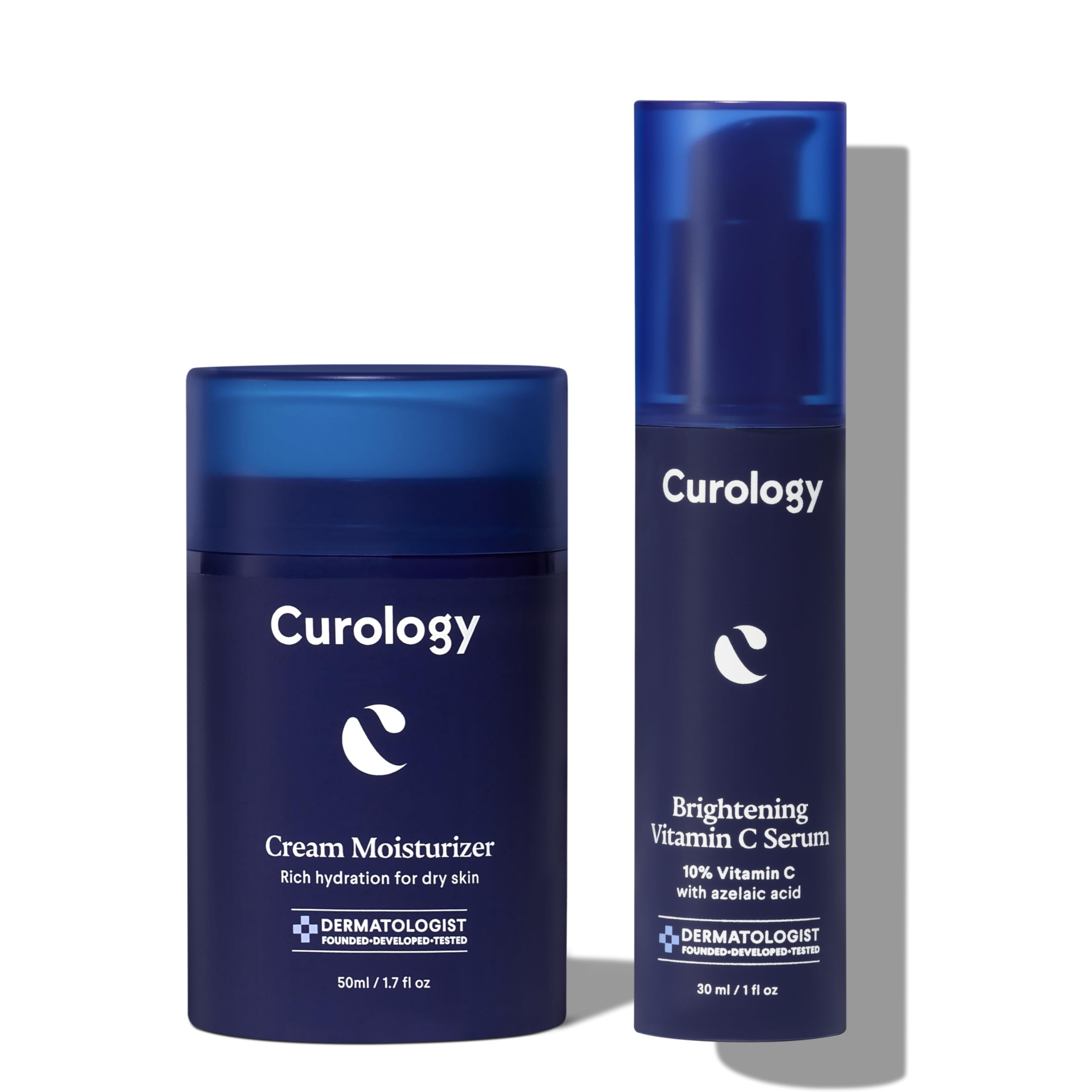 Curology Brightening Vitamin C Serum: Your daily morning reset starts here. Our Brightening Vitamin C Serum is formulated with 10 Vitamin C to help you glow. The lightweight, milky serum absorbs quickly into skin so you can move smoothly through your morning routine. Azelaic acid visibly smooths and minimizes redness to reveal a brighter, more even-looking complexion so you can brighten up in a breeze. Curology Cream Moisturizer: Powered by 6 key ingredients Allantoin, Aloe Vera, Hyaluronic Acid, Glycerin, Shea Butter and Squalane, the Cream Moisturizer offers a rich boost of hydration—helping restore your skin barrier, without clogging your pores. How to use: On a clean, dry face in the morning, apply a thin, even layer of your Brightening Vitamin C Serum. Follow with the Cream Moisturizer, which can be used twice daily. Finish your morning routine with our Everyday Sunscreen to boost your UV protection. Sunscreen cannot prevent all harm from UV rays. Across our skincare bundle sets kits, you'll love your new routine full of Curology skin care products!CUROLOGY – Dermatologist founded, developed, and tested. DERMATOLOGIST DESIGNED – Fragrance-free, sulfate-free, paraben-free, 100 vegan, cruelty-free skincare, Leaping Bunny Certified. LEVEL UP YOUR ROUTINE – This bundle is designed for all skin types including dry, combination, sensitive, or oily skin. Perfect for men, women, teens, or anyone looking to complement their existing skin care product routine. BRIGHTENING VITAMIN C SERUM – Boosted with azelaic acid, our 10 Vitamin C facial serum visibly brightens up dull skin to help reveal your glow. CREAM MOISTURIZER – Shea butter delivers skin-softening effects while glycerin, aloe, and hyaluronic acid help draw water into your skin to keep it hydrated. Squalane and allantoin condition and help support your skin barrier.