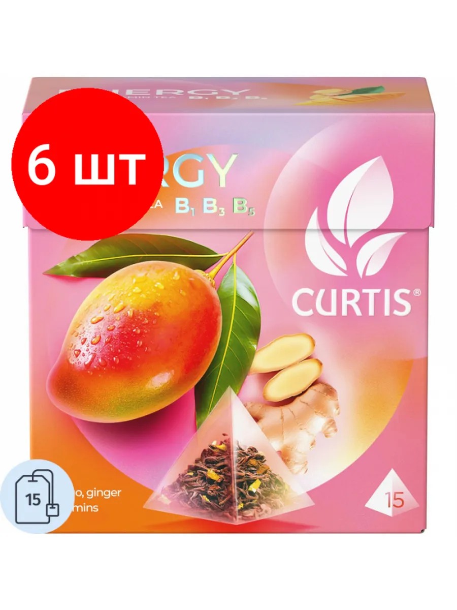 Чай черный Curtis Energy 15 пирамидок (имбирь, манго). Черный чай Curtis 'Energy' - листовой чай, обогащенный витаминами В1, В3, В5. Польза манго, кусочки имбиря, цедра цитрусовых и сила витаминов способствуют поддержанию жизненной энергии. Насладись многогранным вкусом чая Curtis Energy для активной жизни. Удивительные сорта чая в купажах Curtis, неожиданные сочетания крупных кусочков ягод и фруктов дарят разнообразие изысканных, ярких вкусов и ароматов. Выпить чашку чая Сurtis - это удовольствие от момента побыть с собой и помечтать.Состав: цейлонский черный листовой чай, кусочки манго, ароматизаторы 'манго', 'имбирь', 'грейпфрут', цедра цитрусовых, лепестки сафлора и календулы, кусочки имбиря, витамины B1, B3, B5.Способ приготовления: залить чай кипятком, дать чаю настояться 3-5 минут.Количество пакетиков в упаковке: 15 штук.Тип упаковки: картонная коробка.Условия хранения: хранить в чистом, хорошо вентилируемом помещении без посторонних запахов при относительной влажности воздуха не более 70%.Страна производства: Россия.