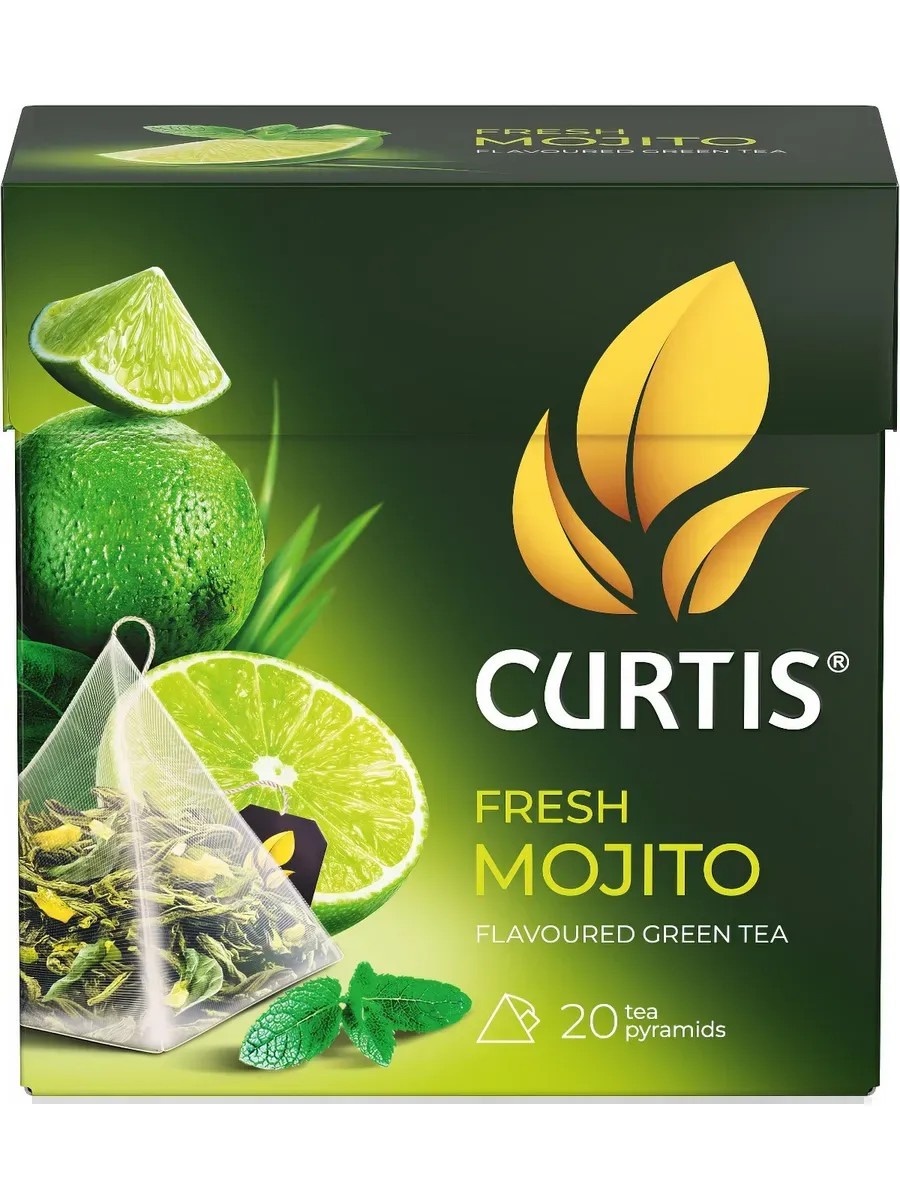 Чай Curtis Fresh Mojito китайский зелёный чай с ароматом мохито, мятой, цедрой цитрусовых и лемонграссом. Солнечный аромат спелого лайма и свежесть мяты перенесут вас в незабываемое путешествие на Кубу. Зелёный чай отличный источник антиоксидантов и питательных веществ, которые благотворно влияют на здоровье.