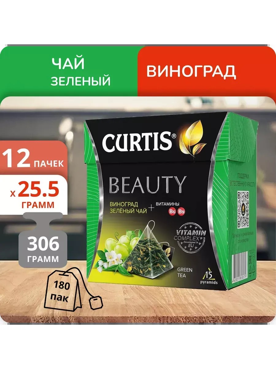 Чай Curtis "Beauty" в пирамидках – китайский зелёный листовой чай, обогащённый витаминами В6, В9. Антиоксиданты зелёного чая, кусочки виноград и сила витаминов способствуют поддержанию красоты и молодости. Насладись чашкой чая Curtis Beauty с изысканным ароматом для естественной красоты. Состав набора: Чай Curtis Beauty (1,7г х 15) х 12 пачек, (Всего в наборе: 180 пак/пирамидки)