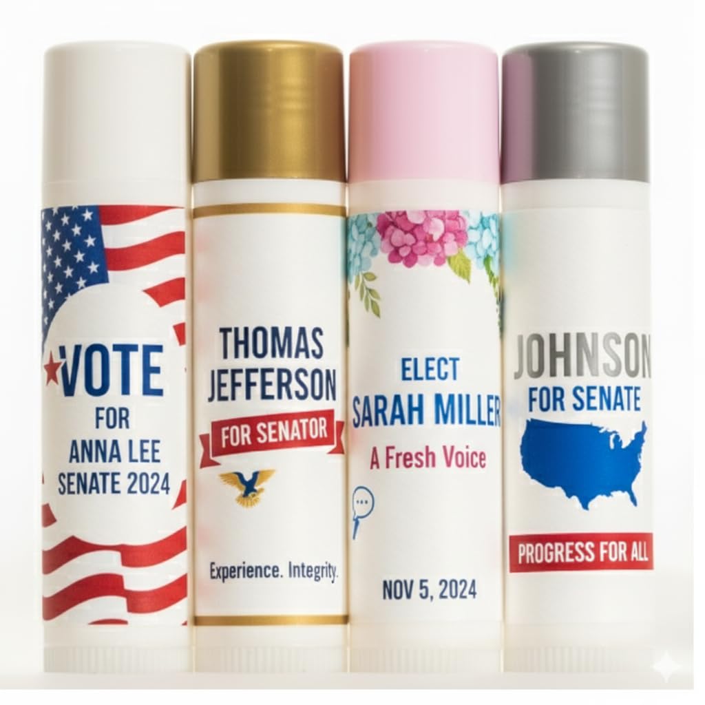 Custom Political Campaign Lip Balm - Win Votes with Memorable Promotional Items! Boost your candidate's name recognition with personalized lip balm campaign giveaways that voters will actually use and remember. Each premium lip balm features your candidate's name, "Vote for" message, and campaign colors. Perfect for political rallies, door-to-door canvassing, fundraising events, and voter outreach programs. High-quality moisturizing formula with weather-resistant labels that won't fade during outdoor campaign events.