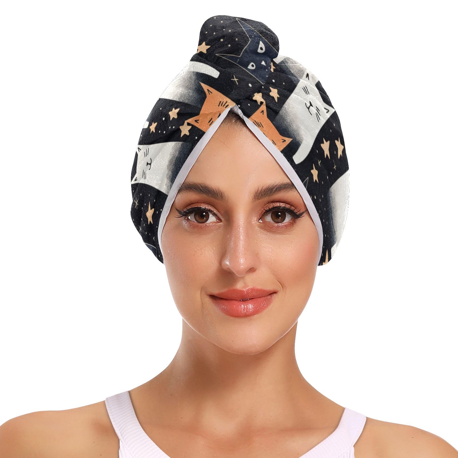 Cute Cats Stars Hair Towel 2 Pack Super Absorbent Hair Drying Towel Quick Dry Hair Turbans Head Towel with Button Twisty Wrap for Women Girls