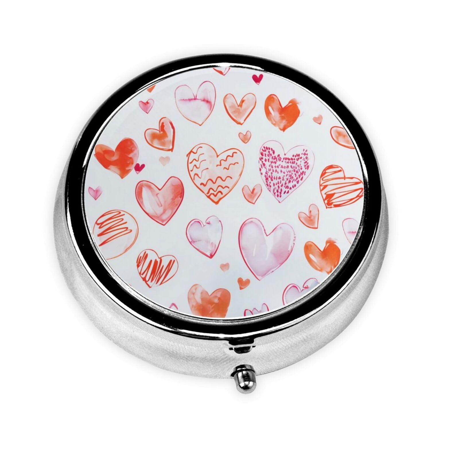 Wide range of applicable scenarios: suitable for use in various occasions such as home, office, and travel, providing you with convenient drug storage solutions. Multi-grid plastic inserts: The medicine box is designed with 3 plastic inserts inside, which can separate and store different types of pills, making them more organized and convenient to use. Convenient opening button design: The medicine box button design is easy to open, convenient and fast, and simple to operate, allowing you to easily access the medicine. Environmentally friendly metal material: Made of environmentally friendly metal iron plating material, it is durable, safe and reliable, and protects medicines from damage. Cute colorful red hearts Portable mini design: round mini pill box, measuring 2.0x2.0x0.7 inches, lightweight and portable, suitable for carrying in pockets and purses, providing you with urgently needed medicines anytime and anywhere.