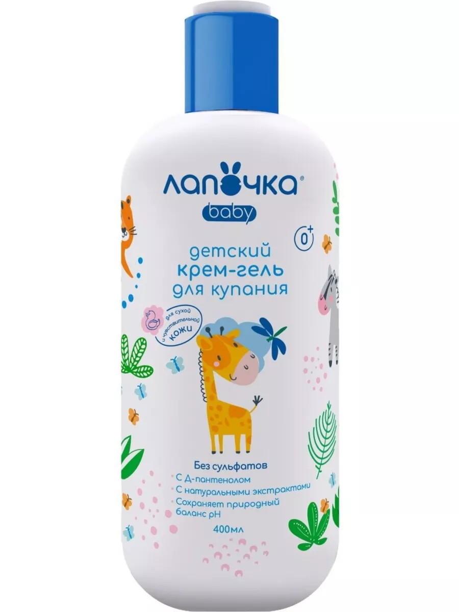 Lapochka, Bath Cream-Gel for Newborns 0+, 400 ml, 1 pc. Lapochka baby bath cream-gel is a product that can turn bathing into a joyful celebration. Gentle and caring, like a mother's hands, it is soap-free and tear-free. The absence of sulfates (SLS, SLES), parabens, chlorides, and dyes makes it suitable for even the most sensitive baby skin from birth. A gentle hypoallergenic powder fragrance included in the product will put a wonderful mood in both mother and baby. Convenient packaging allows you to open and close the bottle with one hand.