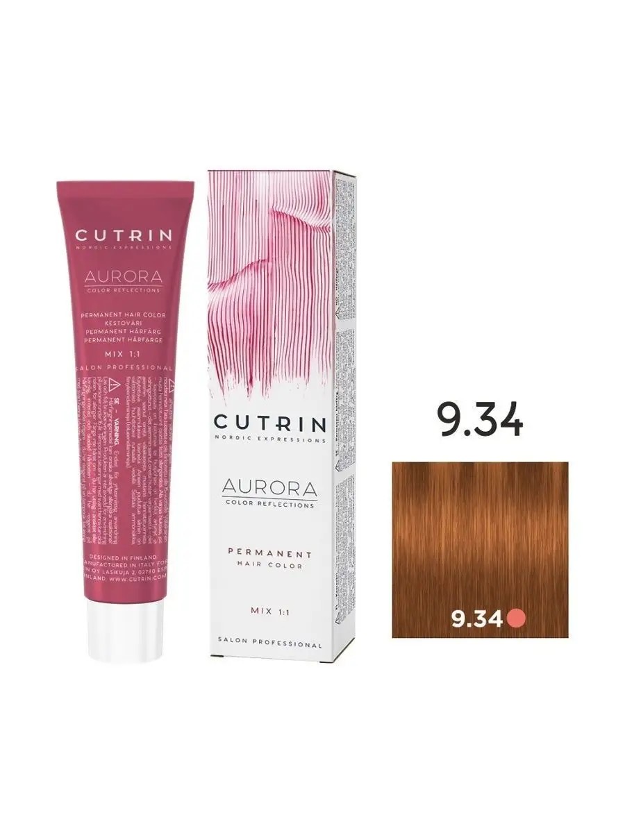 AURORA PERMANENT Hair Color Cream 9.34 Very Light Golden Copper, 60 ml. CUTRIN AURORA permanent hair color contains nourishing natural active ingredients, such as cranberry seed oil, which help restore hair and protect it from damage. After coloring, hair remains in good condition and is easy to comb. Recommended mixing ratio: 1:1.