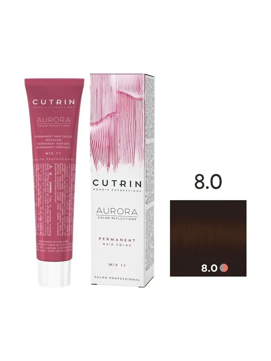 AURORA PERMANENT Hair Color Cream, 8.0 Light Blonde, 60 ml. CUTRIN AURORA permanent hair color contains nourishing natural active ingredients, such as cranberry seed oil, which help restore hair and protect it from damage. After coloring, hair remains in good condition and is easy to comb. Recommended mixing ratio: 1:1.
