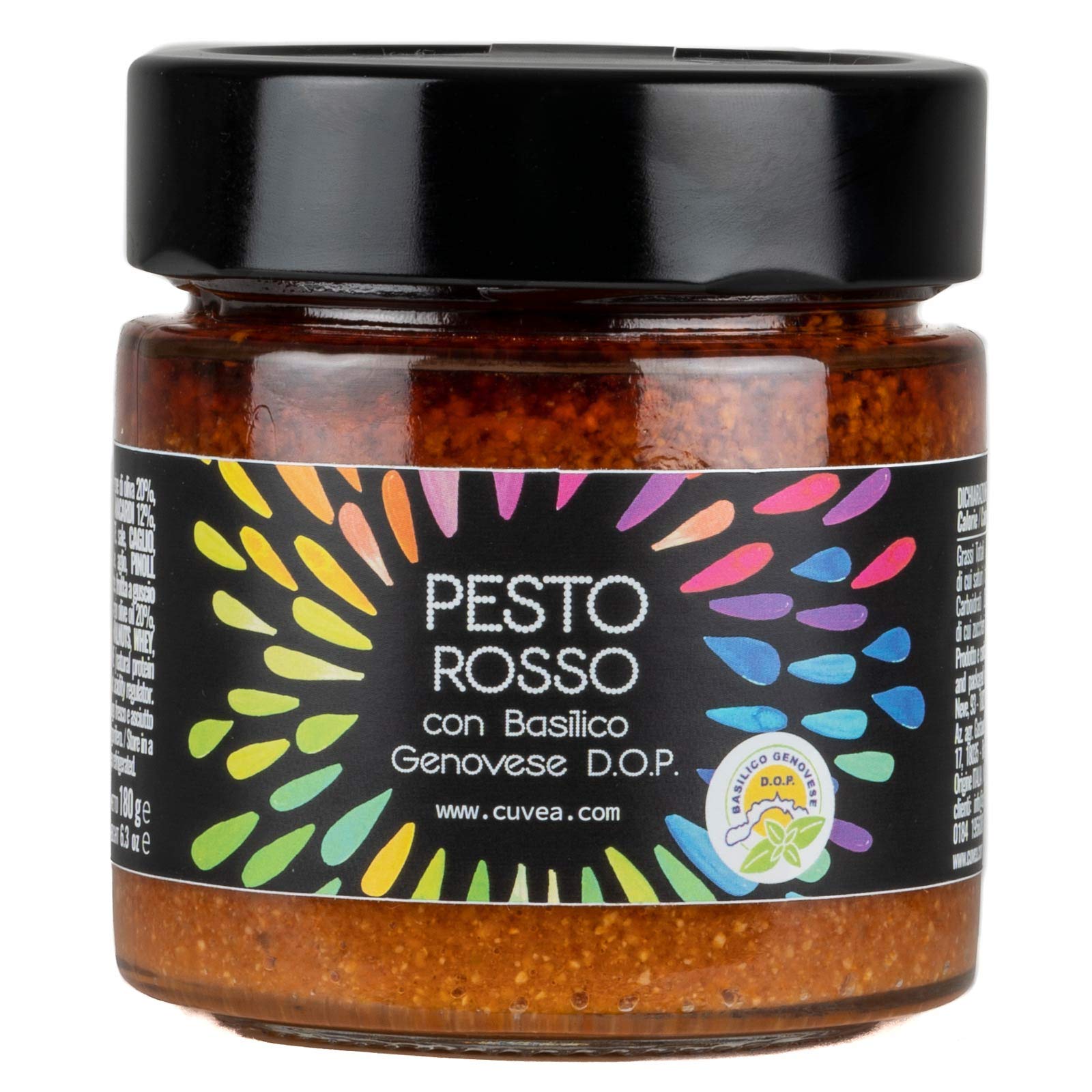 ✓ Pesto Rosso Handmade from Liguria 180 g ✓ INGREDIENTS Basilico Genovese DOP 25 , extra virgin olive oil 20 , tomato pulp 17 , tomato puree 17 , CASHEWS 12 , WALNUTS, Whey, GRANA PADANO D.O.P. (MILK, salt, RENNET, lysozyme [natural protein extracted from EGG]), salt, garlic, PINE LEGS. Citric acid acidity regulator. Contains nuts, milk derivatives and egg. LEGAL DISCLAIMER Store in a cool, dry place away from sources of light and heat. Once opened, store in the refrigerator covered with oil. Nutritional values per 100 g product: Energetic value: 518 kcal - 2170 kJ Proteins: 4.5 g Carbohydrates: 4.9 g of which sugars: 1.5 g Fat: 53.5 g of which saturated: 8.4 g of which trans-saturated: 0.09 g Sodium: 713 mg Fibers: 2.3 gBoerderij Cuvea - Pesto Rosso Handgemaakt uit Ligurië 180 g met Genuese basilicum D.O.P. saus Pasta ideaal voor pasta, lasagne, spaghetti ✓ Pesto Rosso Handgemaakt uit Ligurië 180 g ✓ INGREDIËNTEN Basilico Genovese DOP 25 , extra vierge olijfolie 20 , tomatenpulp 17 , tomatenpuree 17 , CASHEWS 12 , WALNOTEN, Wei, GRANA PADANO D.O.P. (MELK, zout, RENNET, lysozym [natuurlijk eiwit gewonnen uit EGG]), zout, knoflook, PIJNBOOMPOTEN. Citroenzuur zuurteregelaar. Bevat noten, melkderivaten en ei. WETTELIJKE DISCLAIMER Bewaar op een koele, droge plaats uit de buurt van licht- en warmtebronnen. Eenmaal geopend, bewaar in de koelkast bedekt met olie. Voedingswaarden per 100 g product: Energetische waarde: 518 kcal - 2170 kJ Eiwitten: 4,5 g Koolhydraten: 4,9 g waarvan suikers: 1,5 g Vet: 53,5 g waarvan verzadigd: 8,4 g waarvan transverzadigd: 0,09 g Natrium : 713 mg Vezels: 2,3 g
