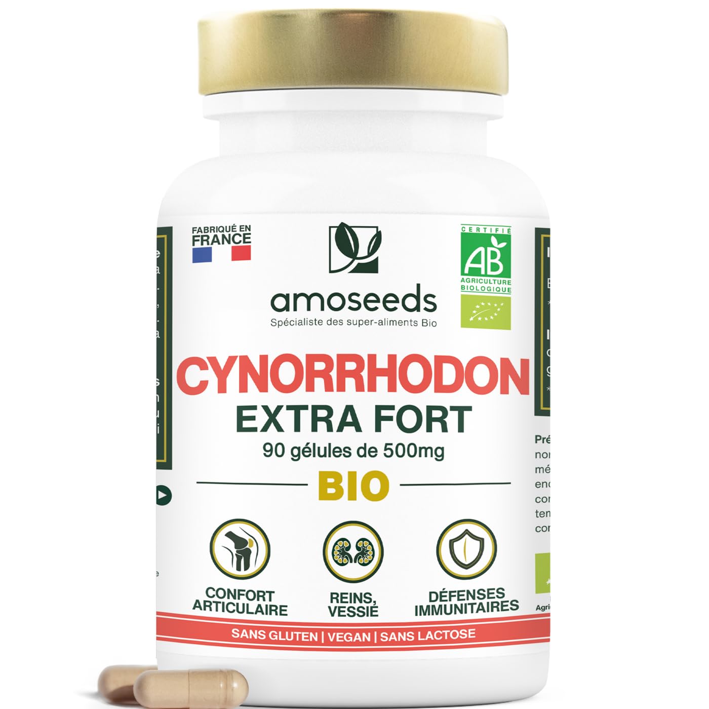 ? CERTIFIÉ BIOLOGIQUE : boîte refermable recyclable de 90 gélules de 500mg d'extrait de coques de cynorrhodon Biologiques de Qualité Supérieure amoseeds. Produit 100 pur, vegan, sans additif, sans conservateur, sans OGM, sans pesticides, sans colorant artificiel, sans gluten et sans lactose. Chaque lot est testé par des tiers afin de s'assurer de leur qualité et leur pureté. Produit extrait, analysé, fabriqué et conditionné en France. ? HAUTE CONCENTRATION : nos gélules de Cynorrhodon Bio contiennent un extrait hautement concentré de coques de cynorrhodons Biologiques, ce qui vous garantit une haute efficacité. Riches en vitamine C et en principes actifs, nos gélules de Cynorrhodon Bio vont agir sur l'ensemble de l'organisme pour contribuer à son bon fonctionnement. ? DIGESTION, REINS, VESSIE : nos gélules de Cynorrhodon Bio sont très bénéfiques pour le système digestif, les reins et la vessie. En effet, elles facilitent la digestion, tout en participant au confort digestif. Consommées quotidiennement, elles contribueront également au bon fonctionnement des reins et de la vessie afin d'aider à conserver la santé des voies urinaires. ? IMMUNITÉ : naturellement riches en principes actifs (polyphénols, flavonoïdes) et vitamine C, les Cynorrhodons Bio vont soutenir les défenses immunitaires. Ils permettent ainsi d'améliorer la résistance de l'organisme face aux attaques extérieures, tout en conservant une grande vitalité. Nous vous conseillons particulièrement de consommer nos gélules de Cynorrhodon Bio lors de changement de saison ou en cas de baisse de vitalité. ? CONFORT ARTICULAIRE : nos gélules de Cynorrhodon Bio contribuent à soulager les inconforts articulaires et seront idéales pour améliorer votre mobilité. En effet, le Cynorrhodon Bio favorise la souplesse et la flexibilité des articulations, tout en les maintenant en bonne santé. Si vous êtes concerné par des inconforts, une perte de mobilité ou que vous êtes sportifs, nos gélules de Cynorrhodon Bio seront idéales pour prendre soin de vos articulations au quotidien.