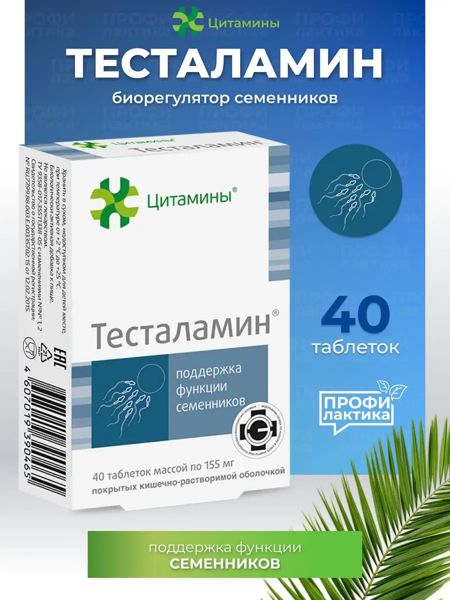 Витаминный комплекс Тесталамин - биорегулятор семенников, рекомендован при снижении уровня тестостерона, снижении качества эрекции и проблемах с зачатием.