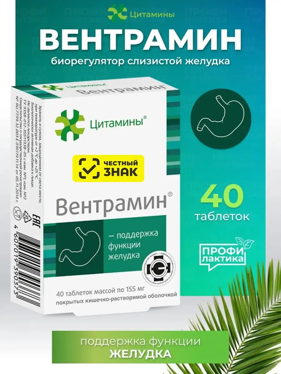 «Вентрамин» биорегулятор слизистой желудка, при язве, гастрите, ГЭРБ и синдроме раздраженного кишечника. Компоненты для «Вентрамина», представляющие собой комплекс белков и нуклеопротеидов, обладающих избирательным действием на клетки слизистой оболочки желудка, получают по специальной, запатентованной отечественной технологии из слизистой оболочки желудка крупного рогатого скота. Действие этих пептидов способствует ускорению репаративных процессов и восстановлению функций слизистой оболочки желудка.