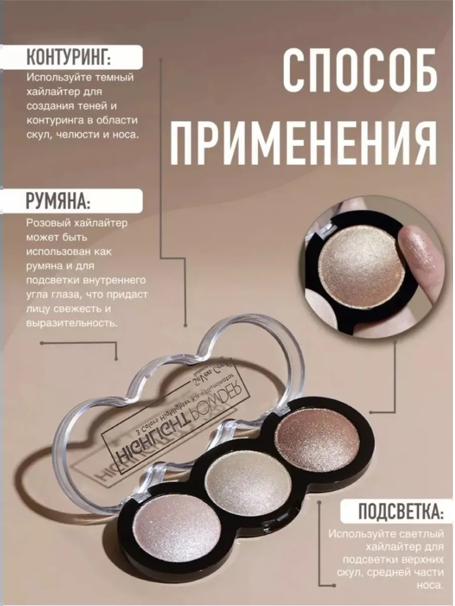 | Комплектация | Хайлайтер Румяна сухие 3в1 |