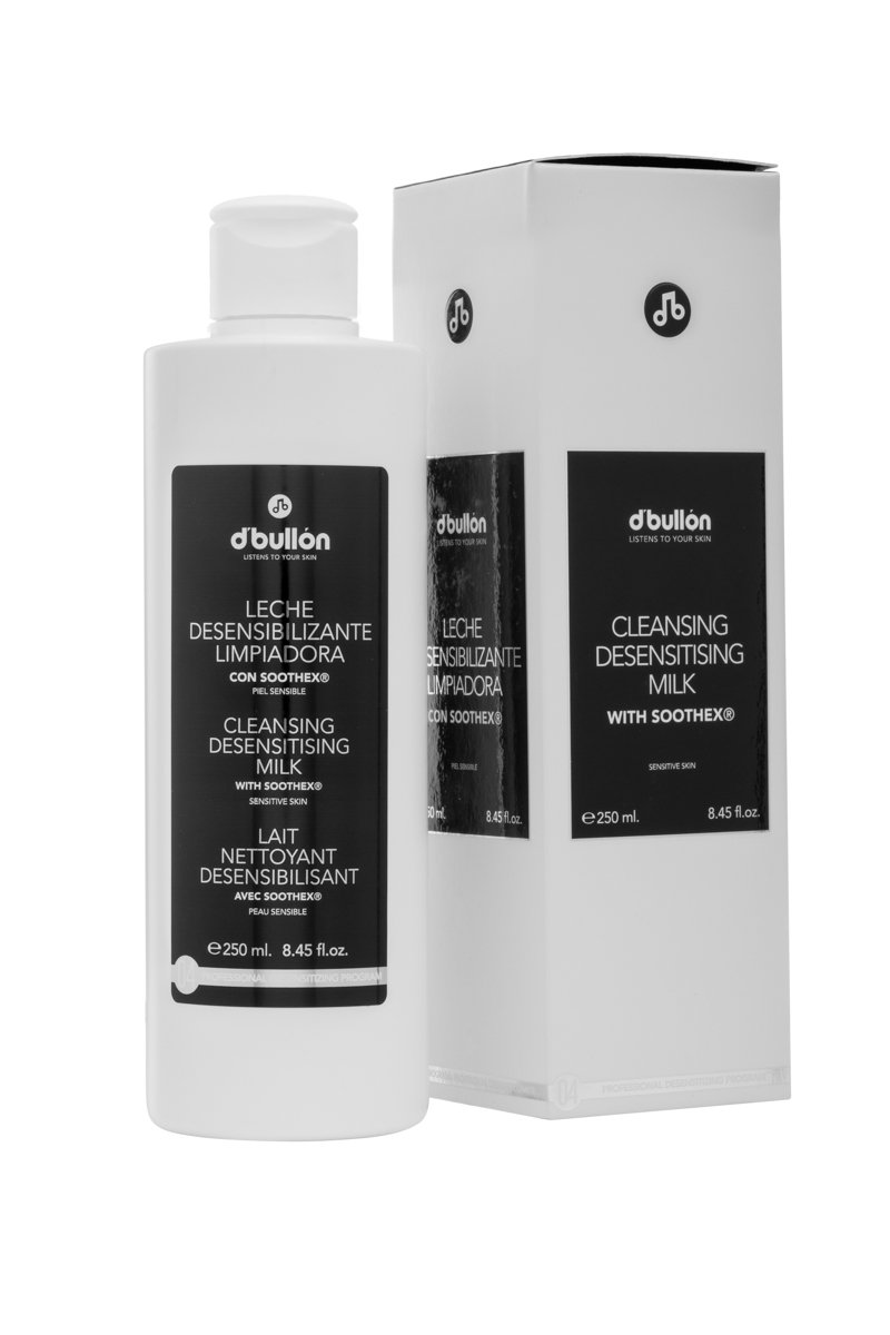 Laboratory and manufacturer certified according to the following standards: ISO 9001, ISO 14001, ISO 22716, Aenor I D i and Halal Certification. Made with purified water. Not tested on animals. Cleanses and removes makeup from sensitive skin. With Soothex: a plant-based active ingredient that helps prevent the appearance of symptoms of skin irritation.Laboratoire et fabricant certifiés selon les normes : ISO 9001, ISO 14001, ISO 22716, Aenor I D i et Certification Halal. Fabriqué avec de l'eau purifiée. Non testé sur les animaux. Nettoie et démaquille les peaux sensibles. Avec Soothex: actif végétale qui éviter l'apparition des symptômes de la peau irritée.D'Bullón Profesional Lait désensibilisant nettoyant avec Soothex, pour peaux sensibles - 250 ml