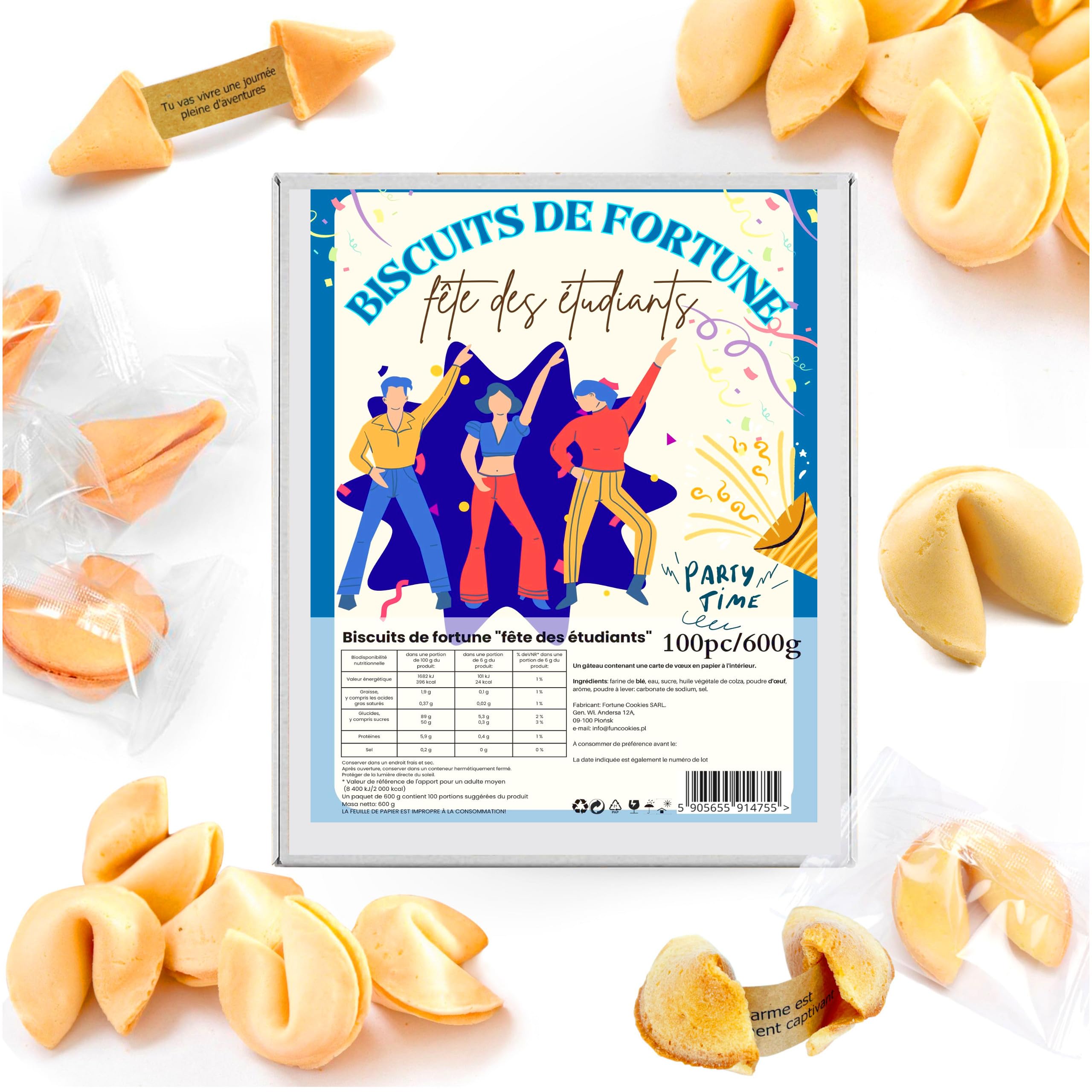 Our magic cookies are a surprising and unusual gift, more exciting than the usual Chupa Chups birthday treats and a healthier option than regular chocolates. Even at Easter, they will generate more enthusiasm among guests than small chocolate Easter eggs. Our fortune cookies are the perfect way to thank your guests. They will add a touch of mystery to your event and attract the attention of each attendee, making their presence memorable. Look to the future with a smile as you discover the secret messages hidden in our fortune cookies. They're not just a treat they're also an opportunity to approach each new day with optimism and joy, which is so easy to share with others. Each of our fortune cookies is unique, containing one of over 600 variations of carefully chosen texts to make your day unforgettable. Each fortune cookie feels like it was designed especially for you. Carefully wrapped in custom foil, our fortune cookies are a testament to our attention to detail and dedication to our product. Our unique fortune cookie recipe uses only fresh, natural ingredients, making them not only delicious but also extremely safe for your body.Nos biscuits magiques sont un cadeau étonnant et inhabituel, plus excitant que les habituels chupa chups d'anniversaire, et une option plus saine que les chocolats habituels. Même à Pâques, ils susciteront plus d'enthousiasme chez les invités que les petits œufs de Pâques en chocolat. Nos biscuits de fortune sont la solution idéale pour remercier vos invités. Ils ajouteront une touche de mystère à votre événement et attireront l'attention de chaque participant, ce qui rendra leur présence mémorable. Regardez l'avenir avec le sourire en découvrant les messages secrets cachés dans nos biscuits de la chance. Ce n'est pas seulement une friandise, c'est aussi l'occasion d'aborder chaque nouvelle journée avec optimisme et joie, qu'il est si facile de partager avec les autres. Chacun de nos biscuits chinois est unique car il contient à l'intérieur l'une des 600 variations de textes soigneusement choisis pour rendre votre journée inoubliable. Chaque biscuit chinois donne l'impression d'avoir été pensé personnellement pour vous. Soigneusement emballés dans une feuille d'aluminium personnalisée, les biscuits de la fortune sont l'exemple même de l'attention portée aux détails et de l'amour pour notre produit. Notre recette unique de biscuits de fortune n'utilise que des ingrédients frais et naturels, ce qui les rend non seulement très savoureux, mais aussi extrêmement inoffensifs pour votre corps.