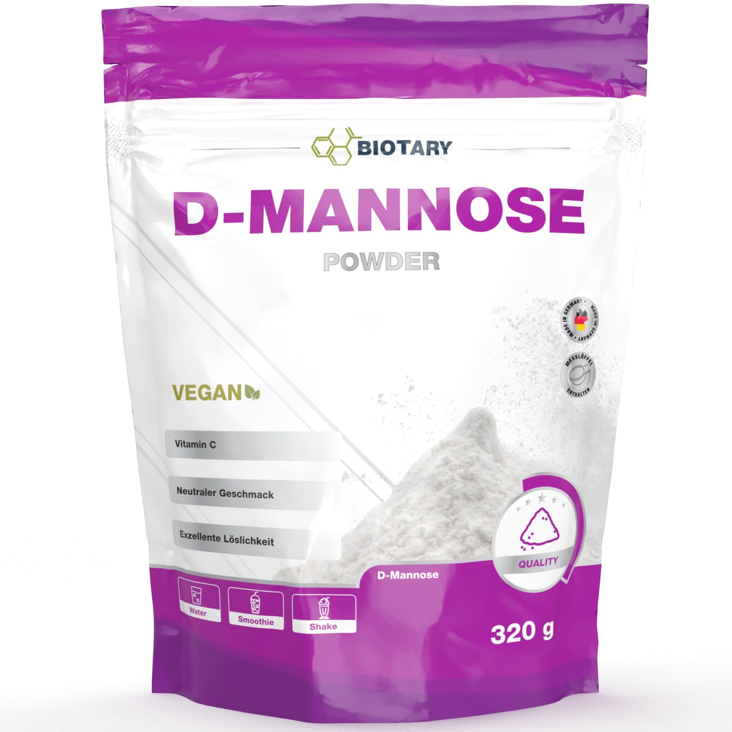 Product assurance: Our products are manufactured exclusively in Germany. They are subject to strict ISO 9001, HACCP, and GMP certifications, which is the only way to achieve high-quality product status. Made in Germany! Superior quality: Produced through natural fermentation, it achieves high bioavailability and can therefore be quickly absorbed and utilized by the body. As an additive, we use only rice extract and no magnesium stearate. Vegan and additive-free – This BIOTARY product is 100 plant-based. It is completely allergen-free, flavor-free, gluten-free, lactose-free, soy lecithin-free, aspartame-free, and GMO-free. We offer high-dose D-Mannose powder, with 2000 mg per daily dose (1 scoop). You will receive a total of 320 g of pure D-Mannose powder. This quantity is sufficient for 5 months at the recommended daily dose of 1 scoop.Assurance produit : nos produits sont fabriqués exclusivement en Allemagne. Ils sont soumis aux certifications strictes ISO 9001, HACCP et GMP et c'est la seule manière d'obtenir le statut de produit de haute qualité. Fabriqué en Allemagne!. Qualité supérieure : issu d'une fermentation naturelle, il atteint une biodisponibilité élevée et peut donc être rapidement absorbé et utilisé par l'organisme. Comme additif, nous utilisons uniquement de l'extrait de riz et aucun stéarate de magnésium. Vegan sans additifs – Ce produit BIOTARY est 100 végétal. Il est absolument sans allergène, sans arôme, sans gluten, sans lactose, sans lécithine de soja, sans aspartame et sans OGM. Nous proposons de la poudre de D-Mannose à haute dose, à raison de 2000 mg par dose quotidienne (1 cuillère doseuse). Vous recevrez un total de 320 g de poudre pure de D-Mannose. Cette quantité est suffisante pour 5 mois à la dose quotidienne recommandée de 1 cuillère doseuse.D-Mannose Poudre – 2000 mg portion quotidienne - 320 g – 5 mois – avec vitamine C – avec pilulier – testé en laboratoire – végétalien – qualité supérieure – 100 naturel – sans additifs