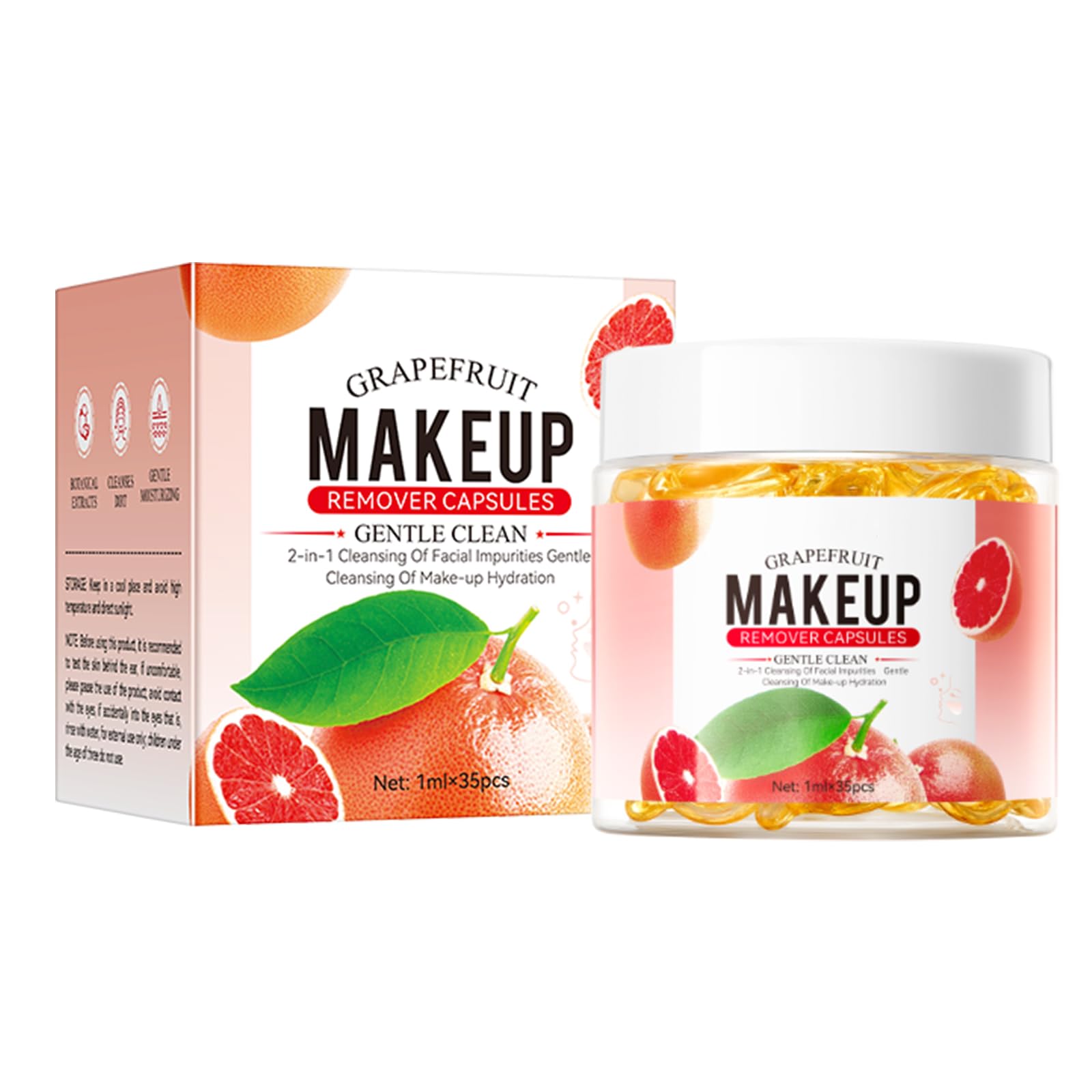 : Grapefruit Makeup Remover Capsules. Safety Warning andREFRESHING AND CLEAN FEELING: Our grapefruit makeup remover capsule leaves your skin feeling clean and refreshed. The natural grapefruit scent provides a pleasant and invigorating experience, making the makeup removal process enjoyable. FAST AND THOROUGH REMOVAL: Enjoy fast and thorough makeup removal with our grapefruit makeup remover capsule. The powerful yet gentle formula easily dissolves makeup. This ensures you can remove your makeup quickly and effectively. GENTLE ON SKIN: Our makeup remover is designed to be gentle on all skin types. The non-irritating formula ensures it won't cause redness or discomfort, making it safe for daily use. Whether you have dry, oily, or combination skin, this remover offers a soothing and effective way to cleanse your skin. EASY TO USE AND PORTABLE: Each capsule contains just the right amount of solution, making it easy to use and perfect for on-the-go use. The compact packaging ensures you can take it with you wherever you go, providing a quick and effective way to remove makeup anytime, anywhere. GRAPEFRUIT-BASED FORMULA: Our grapefruit makeup remover capsule is formulated with a refreshing grapefruit-based solution that effectively removes makeup without stripping the skin of its natural oils. The gentle yet powerful formula ensures a thorough cleanse, leaving your skin feeling refreshed and revitalized.Description du produit Capsules démaquillantes au pamplemousse Avertissement De Sûreté etSENTIMENT RAFRAÎCHISSANT ET PROPRE: Notre capsule de démaquillant de pamplemousse laisse votre peau propre et rafraîchie. Le parfum de pamplemousse naturel offre une expérience agréable et revigorante, ce qui rend le processus de maquillage agréable. RETRAIT RAPIDE ET APPROFONDI: Profitez d'un retrait de maquillage rapide et approfondi avec notre capsule de démaquillant de pamplemousse. La formule puissante mais douce dissout facilement le maquillage. Cela garantit que vous pouvez éliminer votre maquillage rapidement et efficacement. DOUCE SUR LA PEAU: Notre dissolvant de maquillage est conçu pour être doux sur tous les types de peau. La formule non irritante garantit qu'elle ne provoque pas de rougeur ou d'inconfort, ce qui le rend sûr pour une utilisation quotidienne. Que vous ayez une peau sèche, grasse ou combinée, ce dissolvant offre un moyen apaisant et efficace de nettoyer votre peau. FACILE À UTILISER ET PORTABLE: Chaque capsule contient juste la bonne quantité de solution, ce qui le rend facile à utiliser et parfait pour - le - go. L'emballage compact garantit que vous pouvez l'emporter avec vous partout où vous allez, offrant un moyen rapide et efficace de supprimer le maquillage à tout moment, n'importe où. FORMULE BASÉE SUR LE PAMPLEMOUSSE: Notre capsule de dissolvant de maquillage de pamplemousse est formulée avec une solution basée sur le pamplemousse rafraîchissant qui élimine efficacement le maquillage sans éliminer la peau de ses huiles naturelles. La formule douce mais puissante assure un nettoyage complet, laissant votre peau rafraîchie et revitalisée.Démaquillant Capsules à L'extrait De Pamplemousse 35 Capsules Individuelles, Nettoyant Visage Hydratant Doux élimine Même Le Maquillage Waterproof Format Voyage