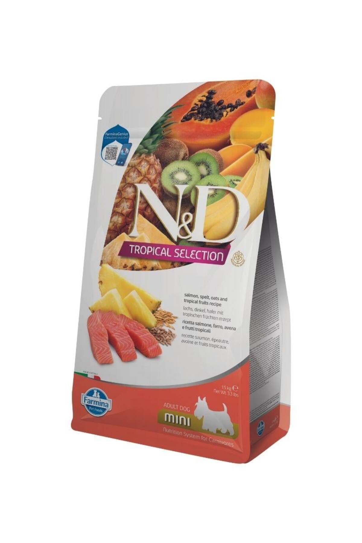 N D Tropical Selection is a complete food formulated for small breed adult dogs. (Tropical fruits, Salmon, dehulled wheat, and oats)