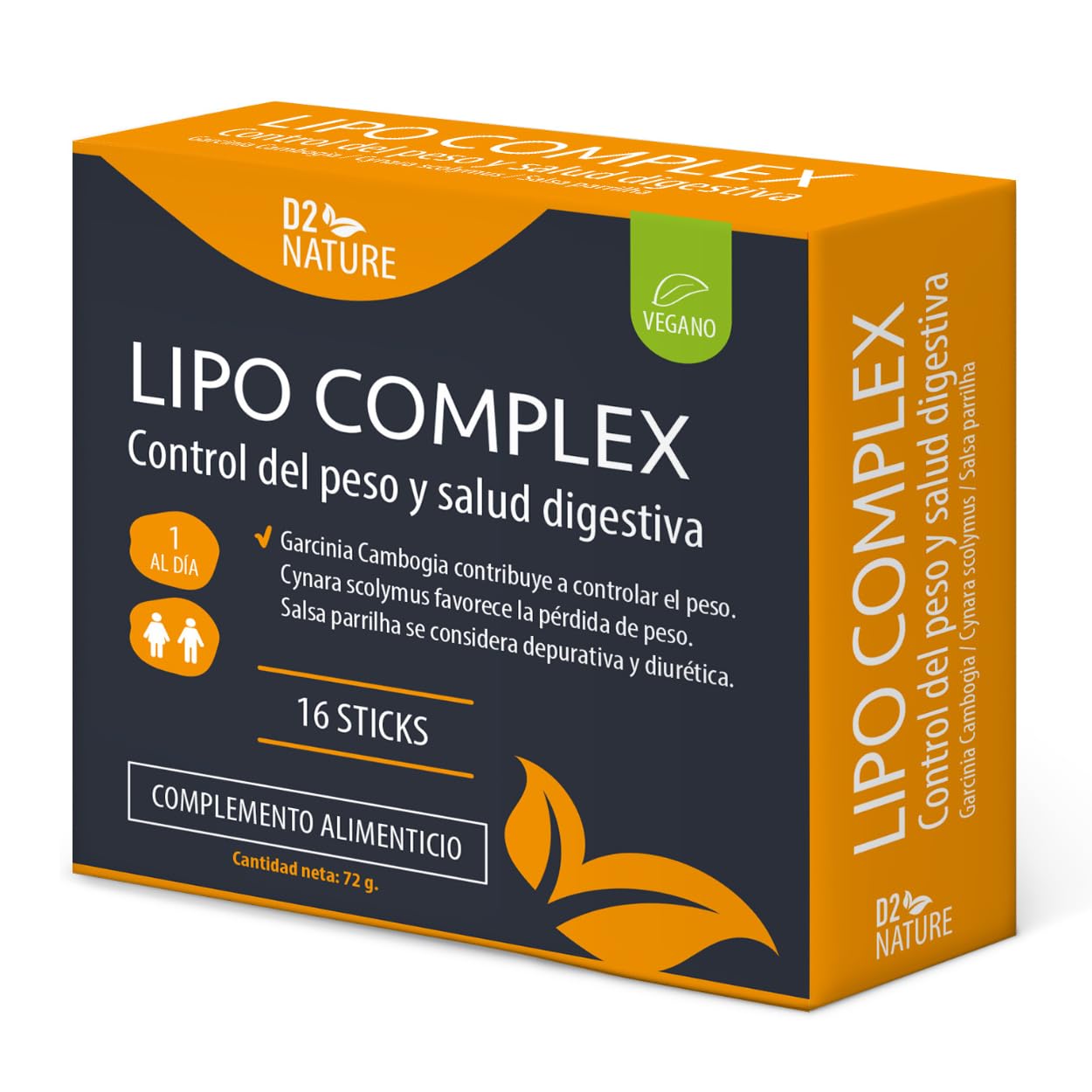 D2 Nature Lipo Complex - 16 sticks - Aide à contrôler les lipides dans le ventre, les hanches, les jambes, le dos et les bras - 4 en 1 - Réserve 16 jours - 1 sachet par jour
