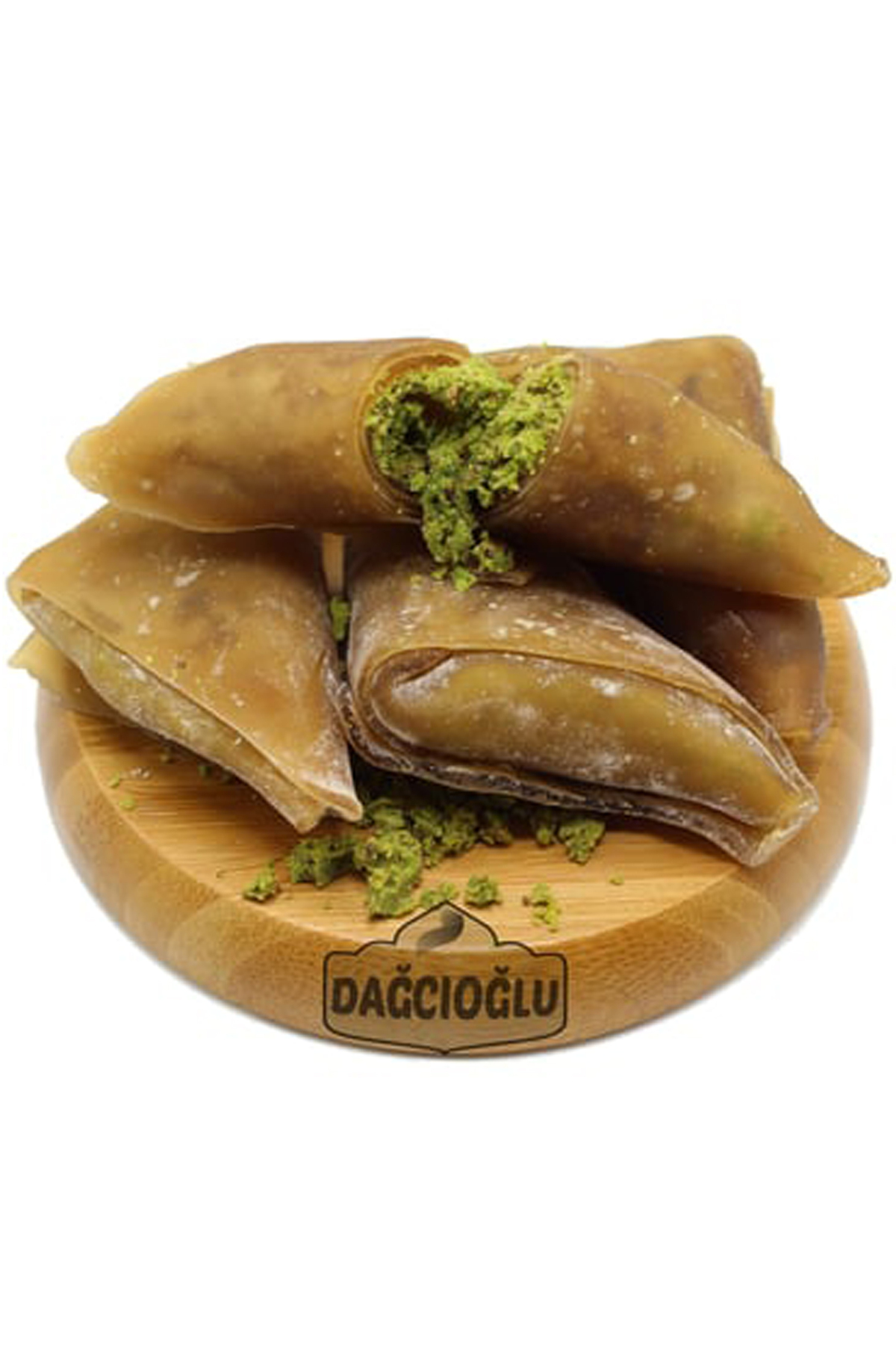 Carefully selected, crispy pistachios are placed inside a thin layer of grape molasses pulp and wrapped in a triangle, creating a delicious amulet.
