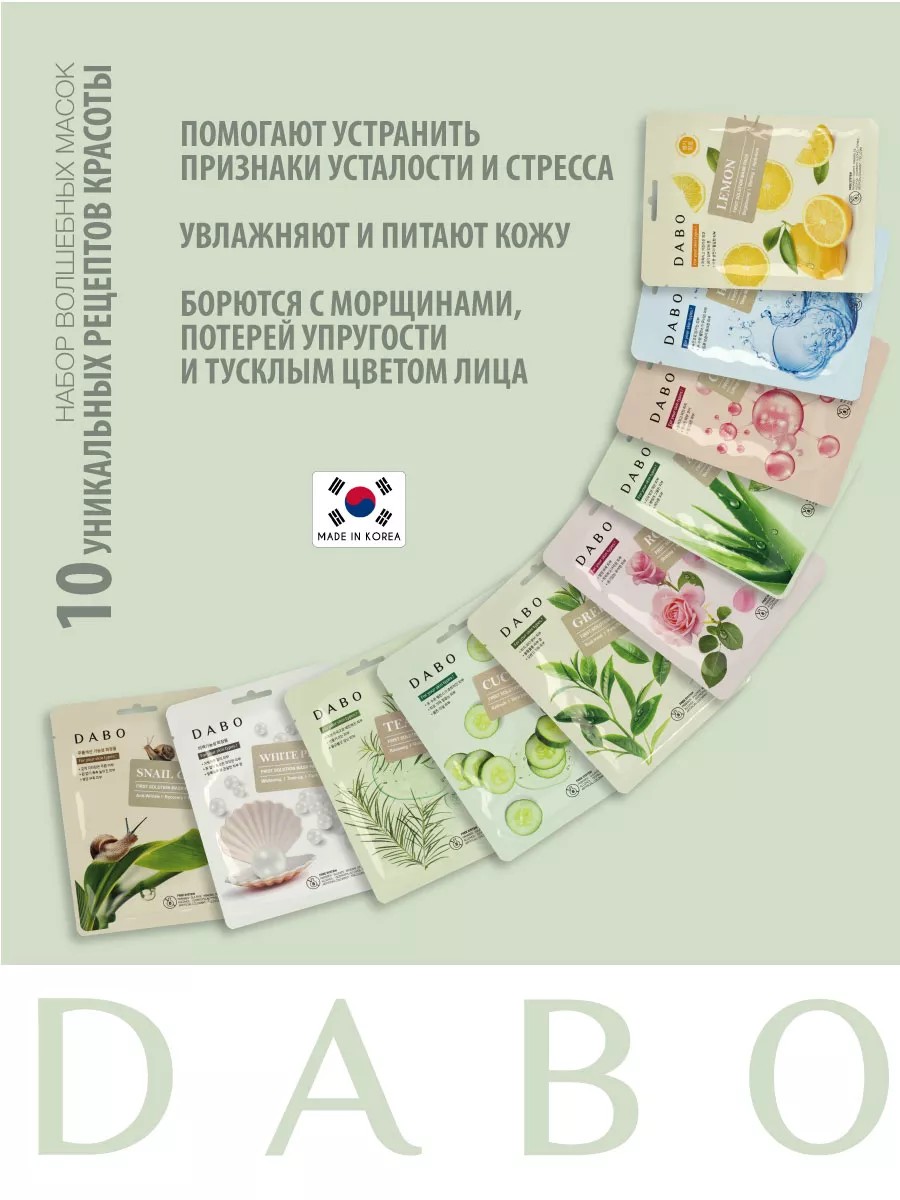 | Комплектация | Набор Волшебных Тканевых Масок DABO: 10 уникальных рецептов красоты - 10шт. |