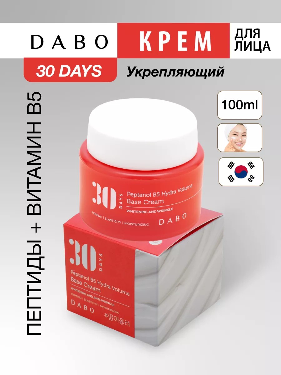 Крем укрепляющий, увлажняющий для ухода за кожей лица, шеи и зоны декольте, Корея. 100 мл. DABO Peptanol B5 Hydra Volume Base Cream, 100ml. Укрепляющий крем обладает множеством полезных свойств. Он глубоко увлажняет кожу лица, делая ее удивительно мягкой и эластичной. Ниацинамид - витамин B3, который является антивозрастным ингредиентом. Он улучшает текстуру эпидермиса и уменьшает видимость морщин, препятствует появлению новых. Пантенол - производный витамина B5, обладающий успокаивающим и увлажняющим эффектом, смягчает раздражения и покраснения. Экстракты моркови зеленого чая ванили амлы и можжевельника содержат полезные вещества, которые укрепляют и питают кожу. Смягчает раздражения и покраснения. Пептиды ( пальмитоил трипептид-1, пальмитоил пентапептид-4, гексапептид-9, ацетил гексапептид-8, трипептид-1, медный трипептид-1 ) способствуют улучшению упругости и уменьшению видимости признаков старения. Гиалуроновая кислота и аллантоин обеспечивают дополнительное увлажнение, успокаивают раздраженный эпидермис и способствуют его защите. Крем корейский призван поддерживать оптимальный баланс влаги, улучшать упругость кожи и предотвращать признаки старения. Подходит для всех типов кожи, в том числе и для проблемной, которой требуется подтягивание, увлажнение и деликатный уход. Применение: наносите необходимое количество крема после очищения кожи, тонера и сыворотки. Повторяйте утром и / или вечером для усиления укрепляющего воздействия. Корейский омолаживающий крем для лица станет идеальным подарком женщине - маме, подруге, девушке на день рождения, новый год, 8 марта. Рекомендуется в комплексе с серией корейской косметики для ухода за лицом и телом DABO / Дабо.