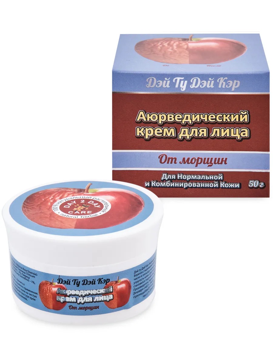 Аюрведический крем для лица "От морщин," 50 г. Дэй ту Дэй Кэр Аюрведический крем от морщин активно борется с видимыми возрастными изменениями: сокращает число и площадь морщин, укрепляет контуры лица и повышает упругость кожи. Цвет кожи лица улучшается. Ваша кожа становится гладкой и выглядит более подтянутой. Приятный аромат подарит наслаждение, а лёгкая текстура позволяет крему быстро впитываться. Каждое утро наносите крем на чистую сухую кожу лица и шеи. Благодаря нежирной текстуре крем можно использовать в качестве основы под макияж. Хранить в прохладном, сухом месте. Срок хранения: 36 месяцев. Day 2 Day Care состав. Аква Экстракта: Роза (Rosa Sinensis) - 3%, Гибискус (Hibiscus Rosa Sinensia)- 3%, Алоэ Вера (Aloe Indica) - 2%, Зародышей Пшеницы (Triticum vulgare) - 2%, Пажитник (Trigonella Foenum) – 2%, Лакрица (Glycyrrhiza Glabra) – 2%, Ашвагандха (Withania Somnifera) – 1%. Основа Q.S