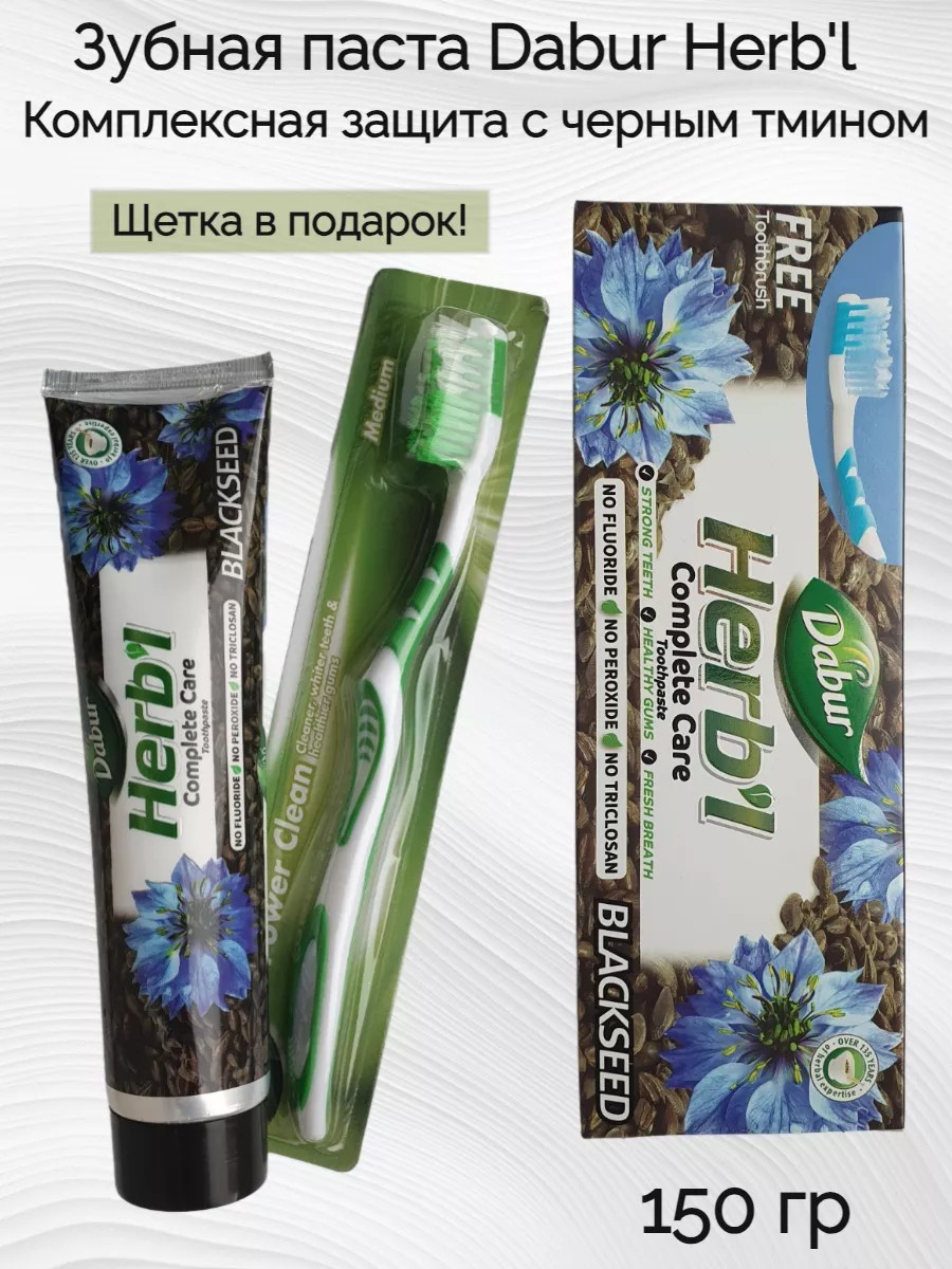 Зубная паста Dabur Herb’l Blackseed complete care (с маслом семян черного тмина) в комплекте с зубной щеткой. Натуральная формула зубной пасты Dabur Herbl Blackseed complete care обладает уникальными свойствами, которые предотвращают зубной налет и укрепляют зубную эмаль обеспечивая сверкающую улыбку и белоснежные зубы