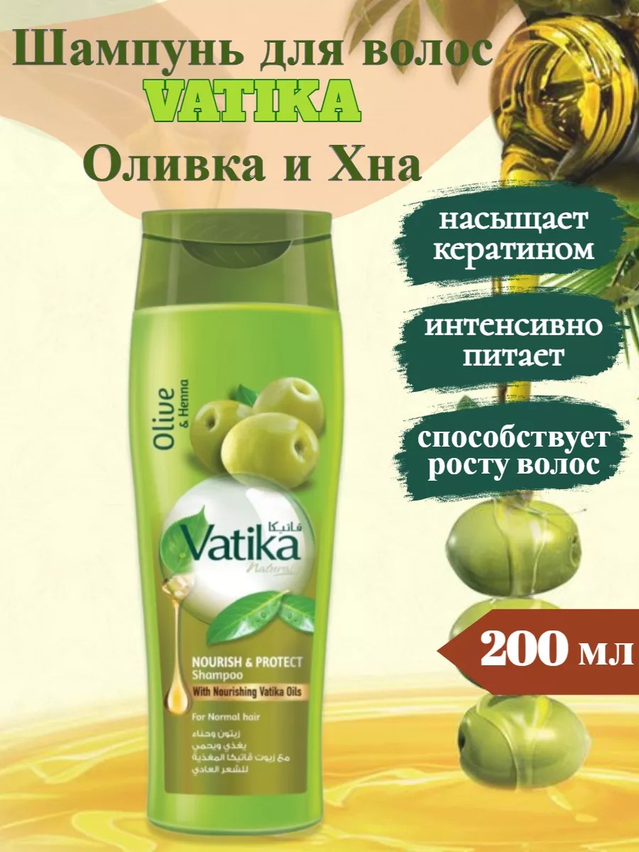 Шампунь Dabur Vatika мягко очищает и питает волосы . Натуральный шампунь имеет идеальный баланс натуральных ингредиентов , таких как хна и оливки . Шампунь с хной и оливковым маслом нежно очищает и питает волосы . Оливковое масло помогает укрепить структуру волос и уменьшает их выпадение . Хна действует как натуральный кондиционер , делая волосы блестящими и шелковистыми . Подходит как для женщин , так и для мужчин . Станет прекрасным подарком на любой праздник . Активные компоненты, входящие в состав шампуня: Оливковое масло - улучшает внешний вид волос, делает волосы шелковистыми и мягкими, при регулярном использовании восстанавливает корни волос, борется с секущимися кончиками. Масло миндаля - питает и укрепляет волосы изнутри, отличное средство для лечения выпадения волос, улучшает рост волос, предотвращает зуд и сухость кожи головы и обеспечивает полноценное питание волосам, придает шелковистость и поддерживает здоровье волос. В нем есть биотин, стимулирующий производство кератина (необходимого для здоровья кожи, волос и ногтей), а также витамин молодости Е. Это отличное питание для волос и кожи головы. Хна - обладает сильными противогрибковыми и вяжущими свойствами, укрепляет корни волос, предотвращает появление перхоти, создает защитный слой на поверхности волоса, придает волосам объем и блеск. Алоэ вера - сохраняет естественный водный баланс, оказывает тонизирующий и заживляющий эффект на кожу головы, имеет бактерицидные, противогрибковые свойства