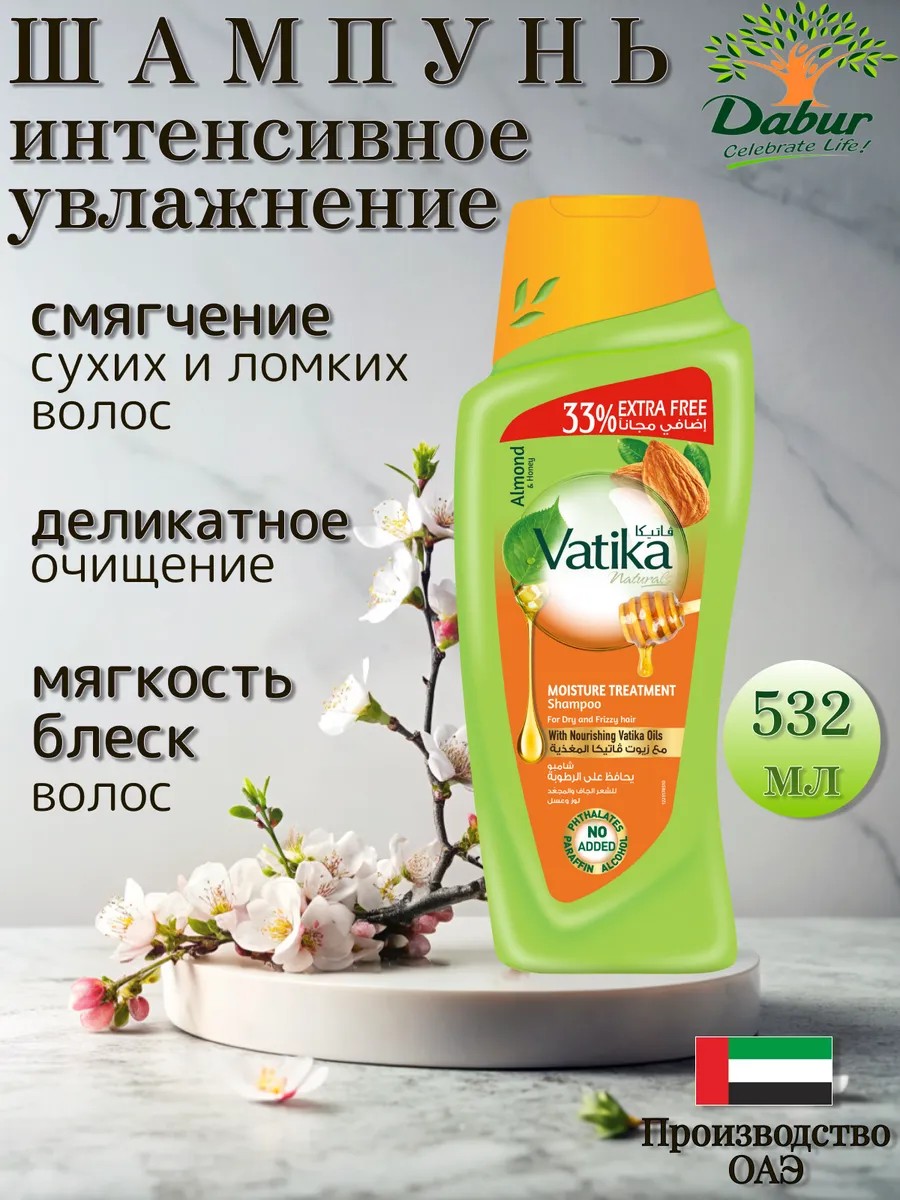 Dabur Vatika Moisture Treatment Ayurvedic shampoo for colored hair contains a complex of natural ingredients ideal for dry, frizzy, or coarse hair. This moisturizing shampoo is suitable for damaged hair, especially after blow-drying, styling products, chemical dyes, and perms. All the ingredients in this shampoo complement each other and, as a result, soften and revitalize dry, brittle hair, smooth even the most unruly hair, eliminate the unpleasant feeling of tightness and dry scalp, perfectly protect against harmful environmental influences, and add shine. Almond is a unique remedy that nourishes and strengthens hair from the inside out and also helps prevent hair loss. Vitamin B6, found in sweet almond oil, improves hair growth, while minerals prevent itching and dry scalp and provide complete nourishment. Sweet almond oil gives hair a natural shine, silkiness, and maintains its health. Honey has a regenerating and nourishing effect, creating a thin coating and maintaining the necessary moisture in each strand, thus making brittle hair smooth and elastic. Yogurt helps maintain the necessary moisture and nourishes dry hair. Henna has strong antifungal properties, strengthens hair follicles, and cleanses the scalp. Henna coats the hair structure, creating a protective layer. Ingredients: Aqua, SLS, Dimethiconol, Cocamide MEA, Cocamidopropyl Betaine, Glycol Distearate, Parfum, Sodium Chloride, Amodimethicone, Sodium PCA, Carbomer, Guar Hydroxupropyl Trimonium Chloride. Panthenol, Sodium Hydroxide, Disodium EDTA, PEG-90M, Opuntia Ficus - indica(Cactus)flower ext, Allium sativum(Garlic)bulb ext, Eruca sativa(Gergir)ext, Lactic Acid, Magnesium Nitrate, Magnesium chloride,Methylchloroisothiazolinone,Methylisothiazolinone,Amyl Cinnamal,Bytulphenyl Methylpropional,Limonene,Linalool,CI47005,CI42090