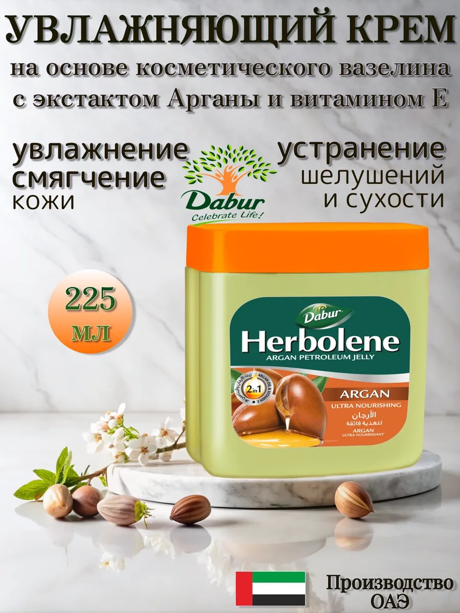 Увлажняющий крем для лица и тела Dabur Herbolene Argan Oil c маслом арганы и витамином Е предназначен для смягчения и увлажнения кожи. Наиболее эффективен при применении для самых проблемных зон – пятки, локти. Может использоваться при обветривании, а также для ухода за нежной кожей ребенка. Вазелиновая основа обеспечивает смягчение, защищает от воздействия УФ–излучения и неблагоприятных погодных факторов. Аргановое масло на 80% состоит из ненасыщенных жирных кислот. Косметический вазелин Дабур защищает от воздействия свободных радикалов, способствует обновлению клеток и омоложению, повышает упругость, увлажняет. Витамин Е является сильным антиоксидантом, необходимым для поддержания молодости и здоровья, активирует процесс регенерации клеток.Состав:Paraffinum Liquidum, Paraffin, Microcristalline wax, Agrania spimosa(Argan) oil, Tocopheryl acetate (Vitamine E) Perfume, BHT, Pentaerythhrityl Tetra-di-bifyl Hydroxydrocinnamate, Benzyl salicylafe, Butylphenyl Methylpropional, Citronellot Hexyl cinnamal, Isoeugenol, Linalool CI 47000, CI 26100