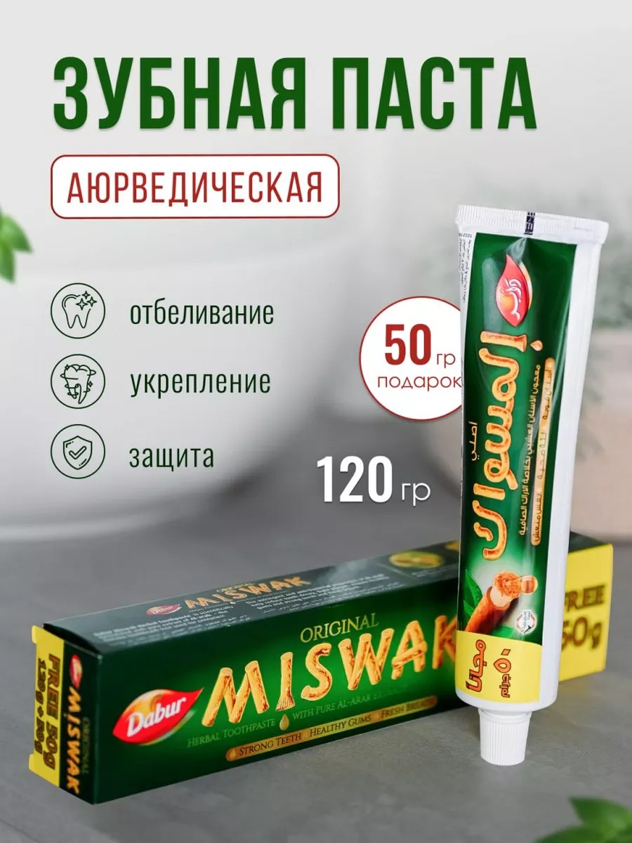 Dabur Miswak toothpaste is one of the best herbal toothpastes for sensitive teeth. Dabur Miswak is a scientifically formulated herbal toothpaste with pure extract of the miswak plant from the Salvadora persica tree, known as (Arak) in Arabic - the famous toothbrush tree used for centuries in the East. This fluoride-free toothpaste has the following beneficial properties: whitening; antibacterial; anti-caries; anti-plaque; for the treatment of diseased gums, etc. Miswak is a rare, powerful, priceless, miraculous herb that provides incredible benefits in dental care. Made in: UAE. Volume: 120+ (50 g. as a gift). Contraindication: individual intolerance.