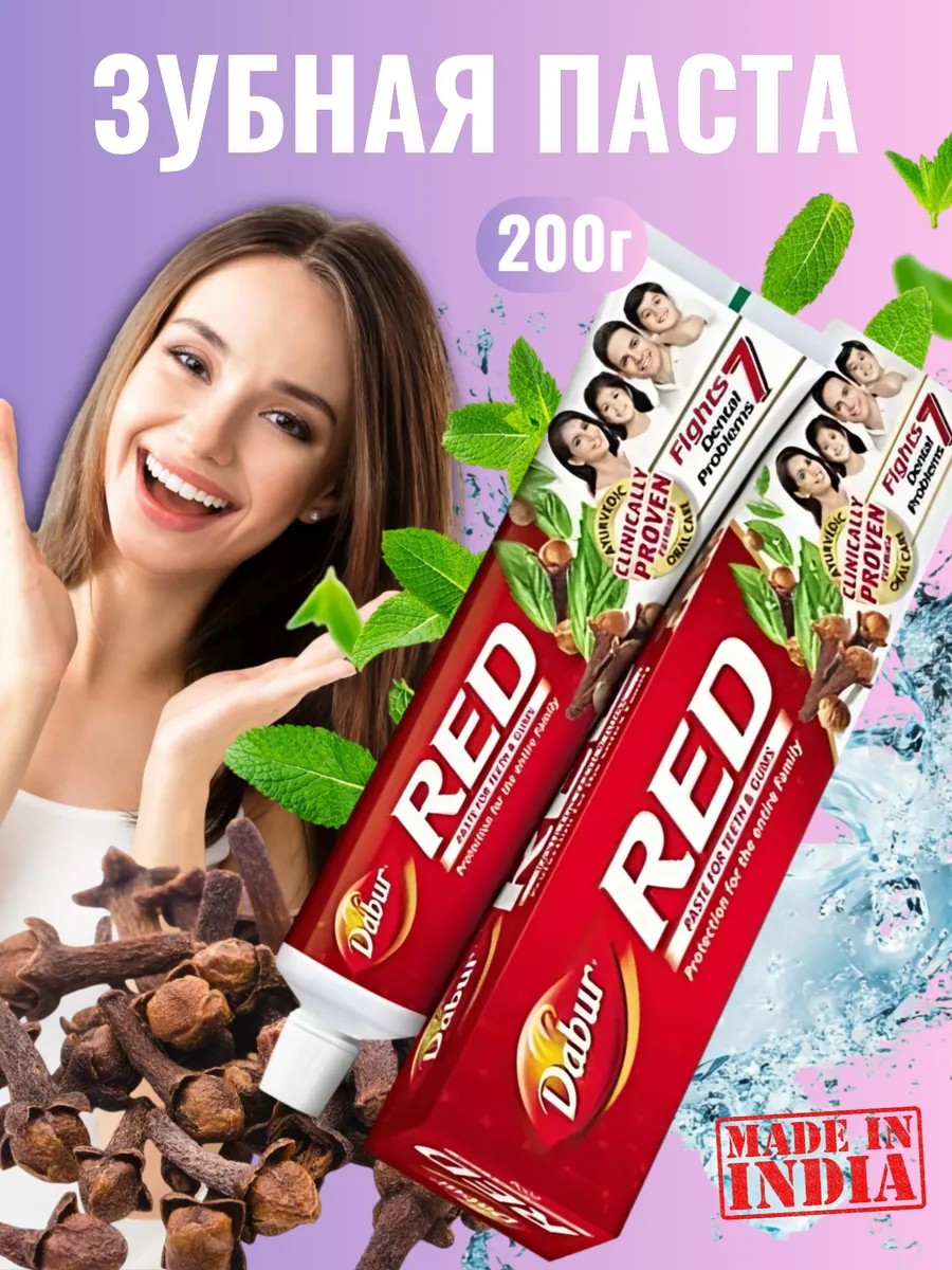 Dabur Red toothpaste is a toothpaste that leaves no one indifferent. It has a strong therapeutic effect and an unusually sharp taste and reddish tint for a toothpaste. It has a strong therapeutic effect on the oral cavity. It has an unusually sharp taste for a toothpaste. It maintains a feeling of freshness for a long time, perfectly strengthens gums and whitens tooth enamel. A special property of this toothpaste is its prolonged therapeutic effect. Natural composition (no dyes or preservatives). - Safe for tooth enamel. - Cloves prevent tooth decay. - Mint has an antifungal and antibacterial effect. - Lavanga - relieves toothache. - Haritaki - an astringent that helps with stomatitis. It is recommended to use the toothpaste 2 times a day like a regular toothpaste. Apply a small amount of paste to your toothbrush and massage your teeth and gums for 2-3 minutes.