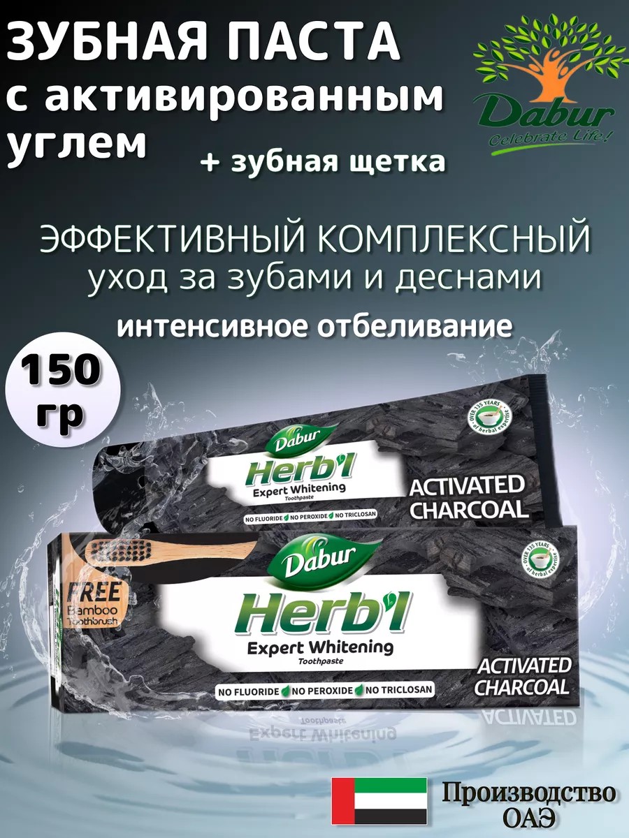 Dabur Herb'l Activated Charcoal toothpaste, a natural toothpaste with activated charcoal, fights plaque, protects tooth enamel from acids, prevents cavities, strengthens tooth enamel, and whitens teeth. The main ingredient in this toothpaste is charcoal, which has long been used in many countries for teeth cleaning. It also contains Ayurvedic herbal ingredients—black and long pepper extracts, zanthoxylum, and ginger. This toothpaste fights plaque and helps whiten and strengthen teeth by saturating them with essential minerals. Dabur Activated Charcoal toothpaste is suitable for sensitive teeth. It is an effective remedy for the prevention and treatment of gum disease (periodontal disease, bleeding). It has antiviral and antiseptic properties. It eliminates unpleasant odor, freshening breath and keeping it fresh all day. It protects teeth and gums from temperature changes and harmful environmental influences. This toothpaste gently whitens teeth, reduces sensitivity, strengthens and restores enamel, and protects against cavities. A comfortable, medium-hardness toothbrush is included with the toothpaste. Ingredients: Sorbitol, Silica, Aqua, PEG-32, Sodium Lauryl Sulfate, Aroma, Xanthan Gum, Tetrasodium Pyrophosphate, Charcoal Powder, Sodium Saccharin, Sodium Benzoate, Herbal Extract (Piper Nigrum Fruit Extract, Piper Longum Fruit Extract, Zanthoxylum Alatum Fruit Extract, Zingiber Officinale Root Extract), Trisodium Phosphate, Tetrapotassium Pyrophosphate, Propylene Glycol, Mica, CI 77891, Benzyl Alcohol, Eugenol.