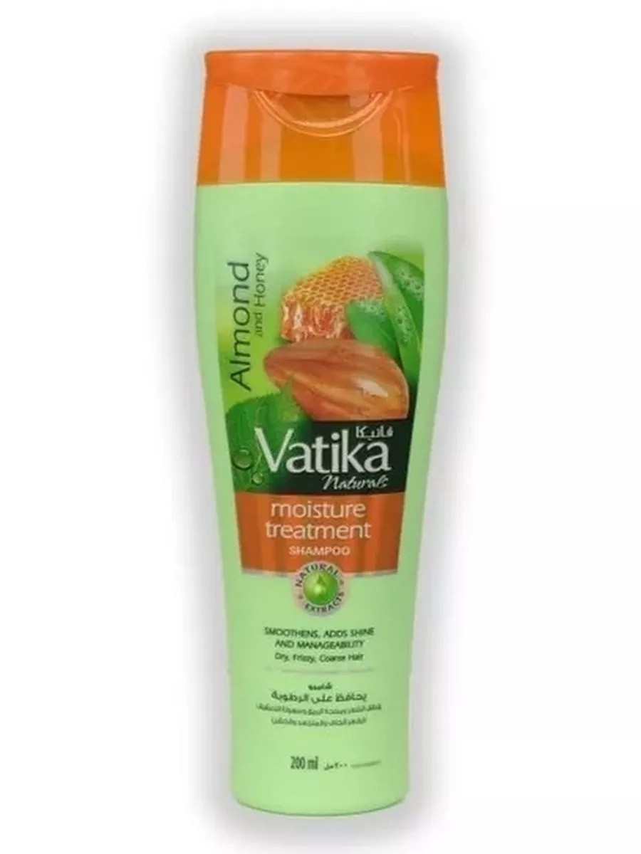Moisture Treatment Dabur VATIKA / Dabur Vatika, Moisturizing Treatment Shampoo with Almond and Honey, 200 ml. This moisturizing shampoo is designed for dry, coarse, curly hair. It contains softening, moisturizing, and nourishing ingredients that will quickly restore hair to its original condition, adding softness, shine, and silkiness without weighing it down, while also relieving itching and dryness. Almonds contain antioxidants that improve skin hydration. They also contain biotin (vitamin B7), which stimulates keratin production, as well as vitamins E and F. Vitamin B6 improves hair growth. Honey, rich in a wide range of beneficial substances, deeply nourishes and moisturizes hair and skin. Henna coats the hair, increasing its strength, thickens the shaft, and protects against negative environmental influences. It strengthens hair follicles, closes cuticles, stopping hair loss, and improves scalp circulation. It's a powerful antifungal agent. It intensively moisturizes hair, detangles it, and makes combing easier.