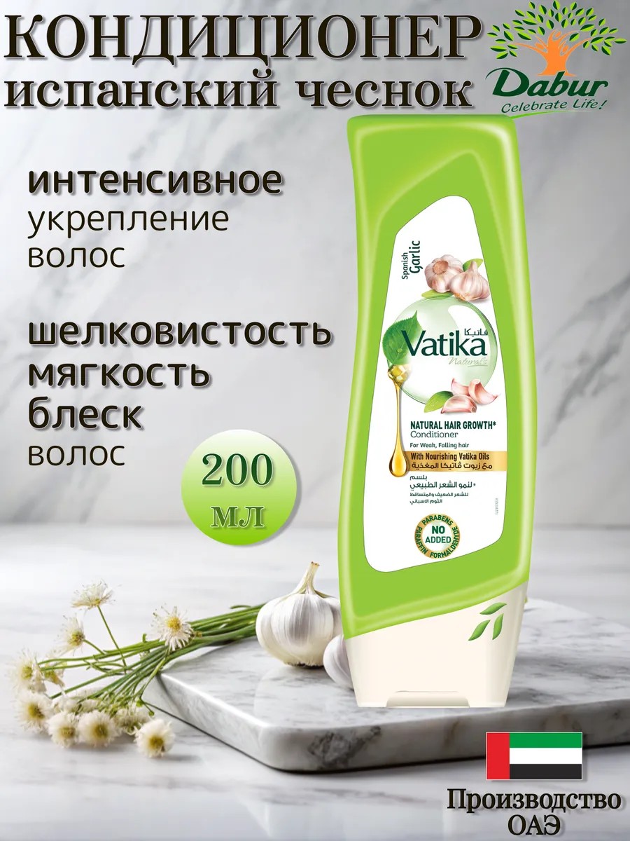 Dabur VATIKA GARLIC Conditioner for brittle and thinning hair with garlic extract, when used regularly, makes hair strong and healthy, stops hair loss, stimulates hair growth, revitalizes, and adds strength, silkiness, shine, and smoothness. Dabur hair conditioner with garlic extract has no unpleasant or pungent odor, while fully preserving all the beneficial properties of garlic. The main active ingredient in the conditioner—garlic—is an effective remedy for hair loss and dandruff. It contains phytoncides—active plant substances that inhibit bacterial growth and help eliminate dandruff—and essential oils that tone the scalp and stimulate blood flow to the hair follicles, resulting in improved hair growth and reduced hair loss. Garlic nourishes and improves hair health, as it contains vitamins (C, E, A, D, and B) and minerals. Directions: Apply a small amount of conditioner to clean, damp hair and distribute throughout. Leave on for 2-3 minutes and rinse with warm running water.