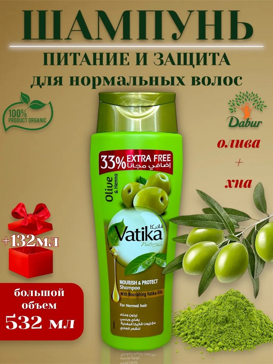 | Комплектация | Шампунь для волос Vatika питательный женский натуральный с миндалем хной алоэ вера оливковый 532 мл |