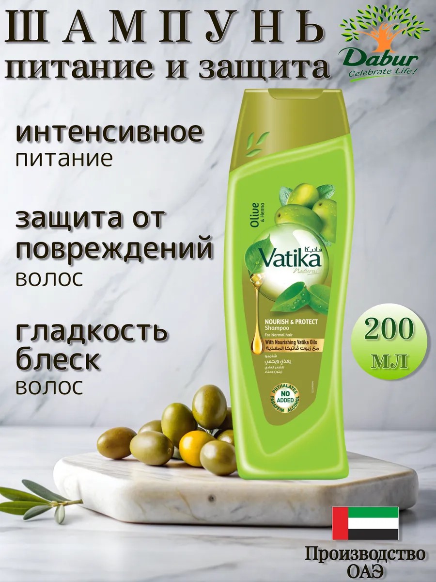 Шампунь для волос Dabur Vatika Nourish & Protect Питание и защита подходит для волос, которые нуждаются в увлажнении и питании. Формула шампуня идеально подобрана для ухода за нормальными волосами, восстанавливает и поддерживает здоровую структуру волос, волосы становятся мягкими и легко расчесываются. Активные компоненты, входящие в состав шампуня: Оливковое масло - улучшает внешний вид волос, делает волосы шелковистыми и мягкими, при регулярном использовании восстанавливает корни волос, борется с секущимися кончиками. Масло миндаля - питает и укрепляет волосы изнутри, отличное средство для лечения выпадения волос, улучшает рост волос, предотвращает зуд и сухость кожи головы и обеспечивает полноценное питание волосам, придает шелковистость и поддерживает здоровье волос. Хна - обладает сильными противогрибковыми и вяжущими свойствами, укрепляет корни волос, предотвращает появление перхоти, создает защитный слой на поверхности волоса, придает волосам объем и блеск. Алоэ вера - сохраняет естественный водный баланс, оказывает тонизирующий и заживляющий эффект на кожу головы, имеет бактерицидные, противогрибковые свойства Состав: Aqua, Sodium Laureth Sulfate, Dimethiconol, Cocamide MEA, Cocamidopropyl betaine, Glycol Destearate, Parfum, Sodium Chloride, Sodium PCA, Amodimethicone, Carbomer, Guar Hydroxypropyltrimonium chloride, Sodium Hydroxide, Panthenol, Disodium EDTA, Aloe Barbadensis (Aloevera) ext, Olea Europaea (Olive) ext, Prunus Amygdalus dulcis (Almond) ext, Lawsonia inermis (Henna) leaf ext, PEG-90M, Lactic Acid, Magnesium Nitrate, Magnesium Chloride, Methylchloroisothiazolinone, Methylisothiazolinone, Amyl Cinnamal, Butylphenyl Methylpropional, Limonene, Linalool, CI 19140, CI 42090.