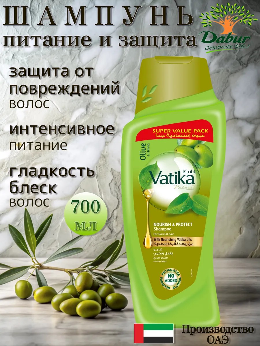 Шампунь для волос Dabur Vatika Nourish & Protect Питание и защита подходит для волос, которые нуждаются в увлажнении и питании. Формула шампуня идеально подобрана для ухода за нормальными волосами, восстанавливает и поддерживает здоровую структуру волос, волосы становятся мягкими и легко расчесываются. Активные компоненты, входящие в состав шампуня: Оливковое масло - улучшает внешний вид волос, делает волосы шелковистыми и мягкими, при регулярном использовании восстанавливает корни волос, борется с секущимися кончиками. Масло миндаля - питает и укрепляет волосы изнутри, отличное средство для лечения выпадения волос, улучшает рост волос, предотвращает зуд и сухость кожи головы и обеспечивает полноценное питание волосам, придает шелковистость и поддерживает здоровье волос. Хна - обладает сильными противогрибковыми и вяжущими свойствами, укрепляет корни волос, предотвращает появление перхоти, создает защитный слой на поверхности волоса, придает волосам объем и блеск. Алоэ вера - сохраняет естественный водный баланс, оказывает тонизирующий и заживляющий эффект на кожу головы, имеет бактерицидные, противогрибковые свойства Состав: Aqua, Sodium Laureth Sulfate, Dimethiconol, Cocamide MEA, Cocamidopropyl betaine, Glycol Destearate, Parfum, Sodium Chloride, Sodium PCA, Amodimethicone, Carbomer, Guar Hydroxypropyltrimonium chloride, Sodium Hydroxide, Panthenol, Disodium EDTA, Aloe Barbadensis (Aloevera) ext, Olea Europaea (Olive) ext, Prunus Amygdalus dulcis (Almond) ext, Lawsonia inermis (Henna) leaf ext, PEG-90M, Lactic Acid, Magnesium Nitrate, Magnesium Chloride, Methylchloroisothiazolinone, Methylisothiazolinone, Amyl Cinnamal, Butylphenyl Methylpropional, Limonene, Linalool, CI 19140, CI 42090.