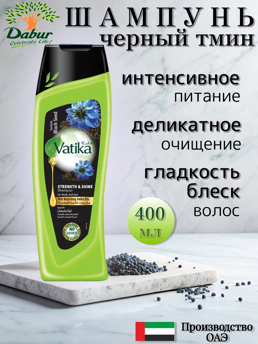 Dabur Vatika Black Seed Strength and Shine Shampoo perfectly nourishes, cleanses, and adds strength and shine to hair. The shampoo's natural ingredients maintain and restore the color of colored hair, improve the appearance of dry hair, and leave it silky and soft. With regular use, Dabur Black Seed Shampoo helps reduce hair loss and prevent split ends and dandruff. The main active ingredient in the shampoo is kalonji seeds (black cumin). Black cumin seeds have pronounced antibacterial and antifungal properties. Black cumin promotes hair growth, nourishes hair roots, prevents inflammation, regenerates inflamed areas of the scalp, softens the scalp, moisturizes, tones, prevents flaking, gives hair a healthy shine, and protects hair from UV radiation. Ingredients: Aqua, Sodium Laureth sulfate, Cocamide MEA, Dimethiconol, Cocamidopropyl betaine. Glycol distearate, Parfum. Prunus amygdalus dulcus (sweet almond), Olea Europaea (Olive) fruit oil, TEA-dodecylbenzenesulfonate, Nigella sativa (blackseed) ext, Rubus Fruticosus leaf ext, Lausonia inermis leaf ext, Guar hydorxypropyltrimonium chloride, Carbomer, Amodimethicone, Trideceth-12, Cetrimonium chloride, Sodium chloride, Sodium Hydroxide, Disodium EDTA, Panthenol. PEG-90M, Sodium PCA, Tocopheryl acetate, Glycerin, Propylene Glycol, Sorbitol, Sodium Benzoate, Potassium Sorbate, Phenoxyethanol, Methylparaben, Ethylparaben, Propylparaben, Butylparaben, Magnesium Nitrate, Magnesium chloride, Methylchloroisothiazolinone, Methylisothiazolinone, Benzyl alcohol, Butylphenyl, Methylpropional, Citronellol, Hexyl cinnamal, Limonene, Linalool, CI 19140, CI 17200, CI 42090