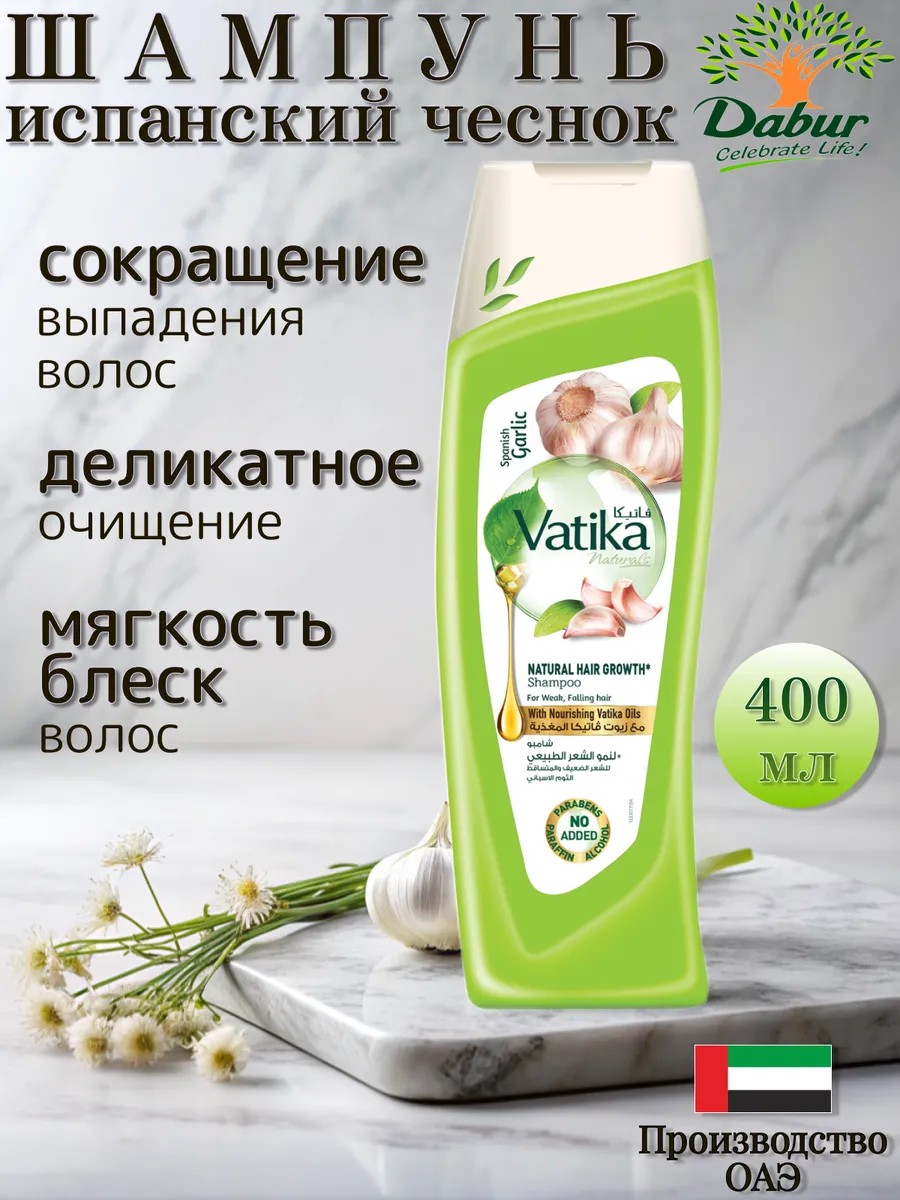 Dabur VATIKA GARLIC Shampoo with garlic extract, when used regularly, makes hair strong and healthy, stops hair loss, stimulates hair growth, revitalizes, and adds strength, silkiness, shine, and smoothness. This garlic shampoo has no unpleasant or harsh odor, while fully preserving all the beneficial properties of garlic, which is an effective remedy for hair loss and dandruff. It contains phytoncides—active plant substances that inhibit bacterial growth and help eliminate dandruff—and essential oils that tone the scalp and stimulate blood flow to the hair follicles, resulting in improved hair growth and reduced hair loss. Garlic nourishes and improves hair health, as it contains vitamins (C, E, A, D, and B vitamins) and minerals. Ingredients: Aqua, Sodium Laureth Sulfate, Cocamide MEA, Dimethiconol, Cocamidopropyl betaine, Glycol distearate, Parfum, Prunus Amygdalus dulcis (sweet almond) oil & Olea Europaea (Olive) fruit oil, Allium sativum (Garlic) bulb ext, Lawsonia inermis (Henna) leaf ext, Sodium PCA, Amodimethicone, Carbomer, Guar Hydroxypropyltrimonium chloride, Sodium chloride, Sodium Hydroxide, Disodium EDTA, PEG- 90M, Panthenol, Tocopheryl acetate, TEA- dodecylbenzene sylfonate, Propylene glycol, Phenoxyethanoil, Methylparaben, Ethylparaben, Propylparaben, Butylparaben, Trideceth-12, Cetrimonium chloride, Magnesium Nitrate, Magnesium Chloride, Methylchloroisothiazolinone, Methylisothiazolinone, Benxyl salicylate, Butylphenyl Methylpropional, Citronellol, Geraniol, Hexyl cinnamal, Limonene, Linalool.