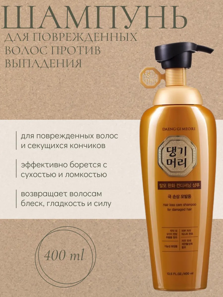 Изготовитель: DOORI COSMETICS Co., LTD., КОРЕЯ, РЕСПУБЛИКА, 588, Dabok-ro, Chubu-myeon, Geumsan-gun, Chungcheongnam-do. Шампунь против выпадения для повреждённых волос Daeng Gi Meo Ri Hair loss care shampoo for damaged hair активно питает и увлажняет, заживляет повреждённую структуру волоса. Эффективно борется с сухостью, ломкостью, возвращает волосам блеск, гладкость и силу. В кратчайшие сроки восстанавливает повреждённые, ослабленные волосы и борется с ломкостью. В состав шампуня входят травы, которые смягчают ломкие и пересушенные волосы. Способ применения: необходимое количество шампуня нанесите на волосы. Помассируйте минуты 2-3 круговыми движениями, после этого хорошо промойте. Если необходимо повторите процедуру