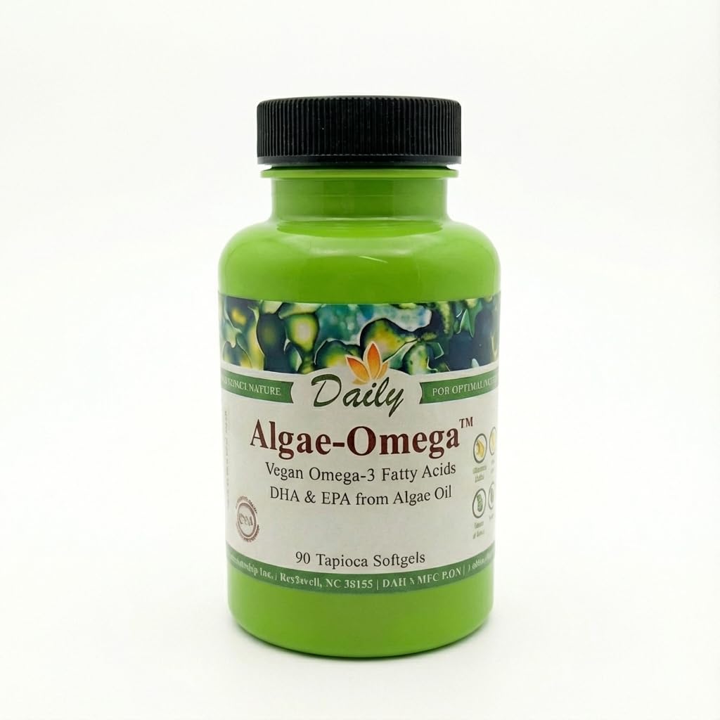 Daily's Algae-Omega is a vegan omega-3 fatty acid supplement. It is especially rich in DHA (docosahexaenoic acid). Unlike fish oils, Algae Oil is cultivated in tanks of purified water free of mercury and toxic chemicals that pollute the ocean. Algae-Omega is Non-GMO. One tapioca softgel provides: Total Omega -3s 300mg, EPA 100 mg, DHA 180 mg. (Algal Oil (Schizochytrium sp.algae), purified water, modified tapioca starch, glycerin, rosemary oil, (preservative), Gluten Free, Soy Free, Vegan) 90 Tapioca Softgels per bottle.Thank you for considering Daily Manufacturing as your source for nutritional supplementation. We value and appreciate your business!. Made in the USA by Daily Manufacturing a family owned IS0-9001:2015 registered FDA inspected facility. Please note: Some products may arrive in white bottles instead of green bottles. CLEAN INGREDIENTS, USA QUALITY: Blending science and nature for optimal nutrition. Our softgels are made from plant-based tapioca starch, not gelatin. The formula is Non-GMO, Gluten-Free, and Soy-Free. Proudly branded as a "USA Quality Product," manufactured in North Carolina to ensure premium standards. HIGH DHA POTENCY FOR BRAIN EYES: The typical Western diet is often low in Omega-3s. Each softgel delivers 300mg of total Omega-3s with a high concentration of DHA (180mg) alongside EPA (100mg). DHA is a key structural component of the brain and retina, making this formula ideal for supporting cognitive function, memory, mood regulation, and visual development. NO FISHY AFTERTASTE OR BURPS: Enjoy the essential benefits of healthy fats without the unpleasant side effects. Our algae-based formula is gentler on the stomach and eliminates the dreaded "fish burps," indigestion, and lingering aftertaste frequently associated with standard fish oil softgels, making it perfect for sensitive individuals.NO FISHY AFTERTASTE OR BURPS: Enjoy the essential benefits of healthy fats without the unpleasant side effects. Our algae-based formula is gentler on the stomach and eliminates the dreaded "fish burps," indigestion, and lingering aftertaste frequently associated with standard fish oil softgels, making it perfect for sensitive individuals. ULTRAPURE MERCURY FREE: Unlike traditional fish oils which can accumulate trace amounts of ocean pollutants, our algal oil (Schizochytrium sp.) is cultivated in controlled environments using tanks of purified water. This ensures a clean, safe supplement free from heavy metals like mercury, PCBs, and toxic chemicals often found in marine sources. THE ORIGINAL, SUSTAINABLE SOURCE: Daily Algae-Omega goes straight to the source—algae—bypassing the fish completely. Fish obtain omega-3s by consuming algae we provide that direct, potent form of EPA and DHA. This is a 100 vegan and vegetarian suitable supplement that is environmentally friendly, relieving strain on ocean ecosystems and avoiding overfishing concerns.