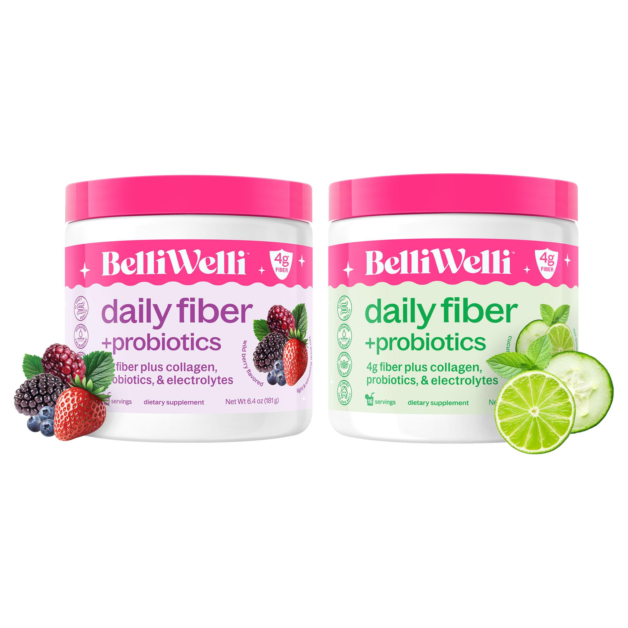 The Daily Fiber Supplement Bundle is your go-to solution for comprehensive digestive health and overall wellness. Offering two refreshing flavors, Cucumber Lime Mint and Wild Berry, this bundle is designed to help you achieve optimal gut health, reduce bloating, and improve digestion. Each serving combines 4g of fiber, collagen, probiotics, and electrolytes, offering four key benefits: enhanced hydration, boosted energy, skin and hair health, and effective digestion. Enjoy the smooth, non-gritty texture and refreshing taste as part of your daily wellness routine. Perfect for those with busy schedules, this convenient powder is easy to mix into water, smoothies, or iced drinks, providing a simple and enjoyable way to take care of your digestive and beauty needs. Whether you're at home or on the go, this bundle offers the perfect balance of convenience and effectiveness, making it easier than ever to stay healthy and energized.Convenient for Busy Lifestyles – Easy to Use Anytime, Anywhere: Whether you're at home, at work, or on the go, our fiber supplements are designed to fit seamlessly into your life. Simply mix one scoop into 10-12 oz of water, add ice for a cool drink, or blend it into your favorite smoothie for a nutrient-packed boost. The portable, convenient packaging makes it easy to take your daily dose of digestive and beauty support wherever you need it, making this bundle the perfect addition to any busy r. Smooth, Refreshing Taste with No Gritty Texture: Unlike traditional fiber supplements, our powders dissolve effortlessly into water, creating a smooth and refreshing drink. Enjoy the Cucumber Lime Mint or Wild Berry flavors without the unpleasant aftertaste or grittiness. These delicious drinks make it easy to enjoy your daily fiber intake, whether you prefer a chilled glass of water, a smoothie, or a refreshing iced drink. Your wellness routine just became more enjoyable. Promotes Digestion, Reduces Bloating Enhances Hydration: Our advanced fiber formula is designed to tackle bloating, regulate your metabolism, and keep you feeling full between meals. With probiotics supporting gut balance and electrolytes enhancing hydration, you'll experience a flatter stomach, less discomfort, and a more energized you. Say goodbye to digestive woes and hello to feeling lighter, fresher, and revitalized with every serving. Physician-Formulated Fiber Blend for Holistic Health: Our premium fiber supplements are crafted by experts to deliver four powerful benefits in one—hydration, energy, skin and hair health, and optimal digestion. The unique blend of fiber, collagen, probiotics, and electrolytes works together to help you feel lighter, more energized, and hydrated while enhancing your skin's natural glow and supporting your metabolism for long-lasting benefits. Two Powerful Flavors for Comprehensive Digestive Wellness Support: Elevate your digestive health with our Daily Fiber Supplement Bundle, featuring two delicious flavors—Cucumber Lime Mint and Wild Berry. Each serving offers a potent blend of 4g of fiber, probiotics, collagen, and electrolytes, designed to promote gut balance, improve digestion, reduce bloating, and support skin health. This bundle gives you variety while maximizing your gut health and overall wellness.
